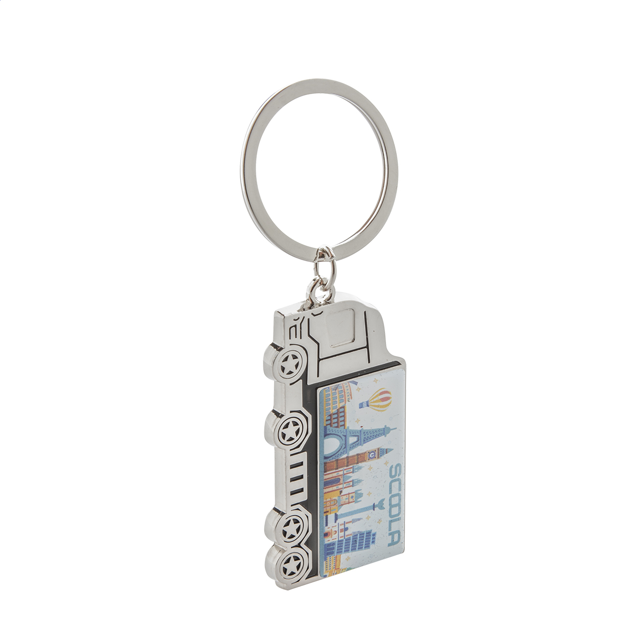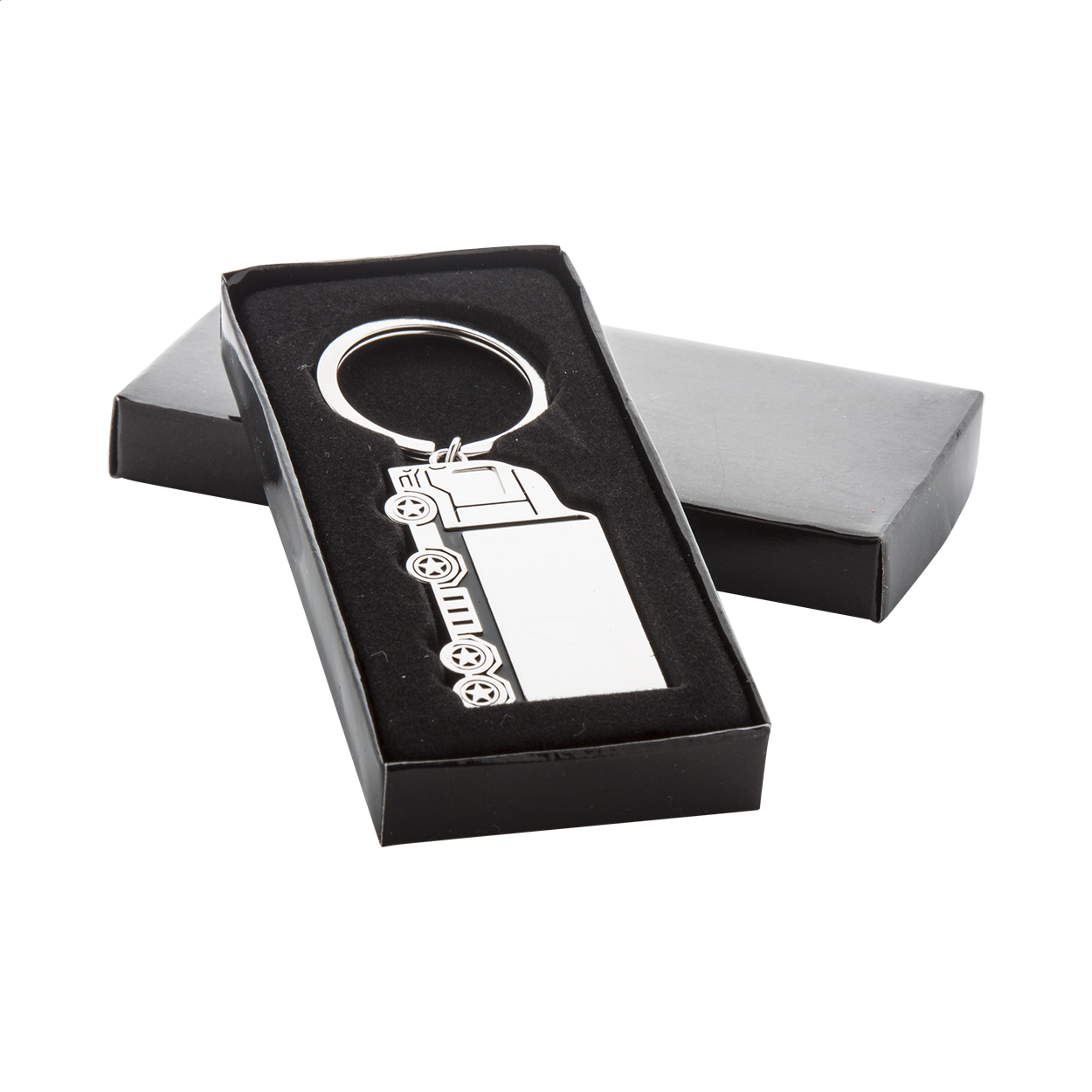 Portachiavi in metallo a forma di camion, in confezione regalo di cartoncino nero.