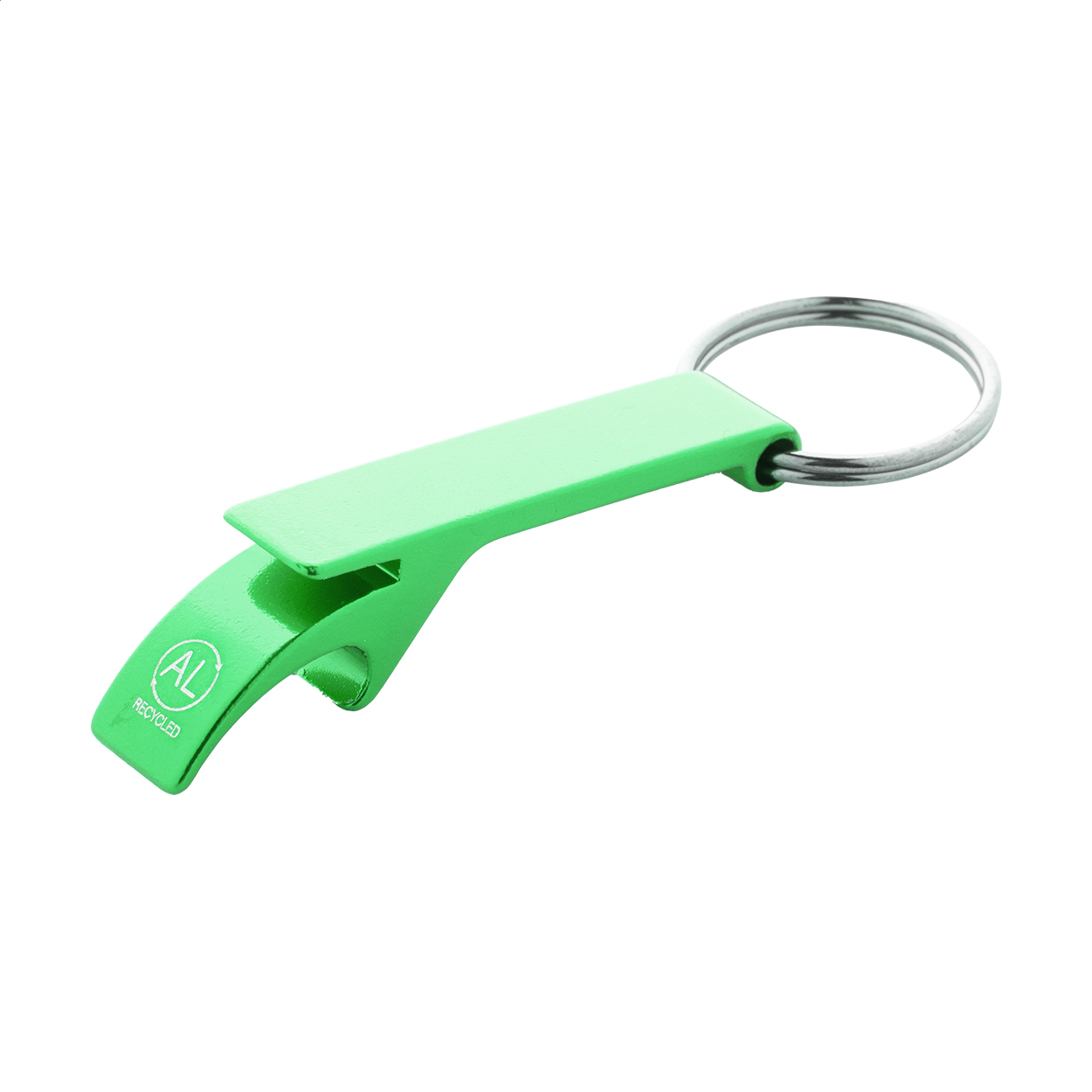 Apribottiglie ed apri barattoli in alluminio riciclato con portachiavi in metallo.