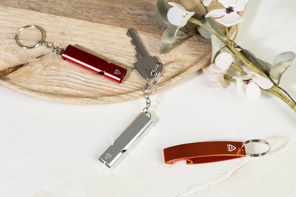 Fischietto in alluminio riciclato con portachiavi in metallo.