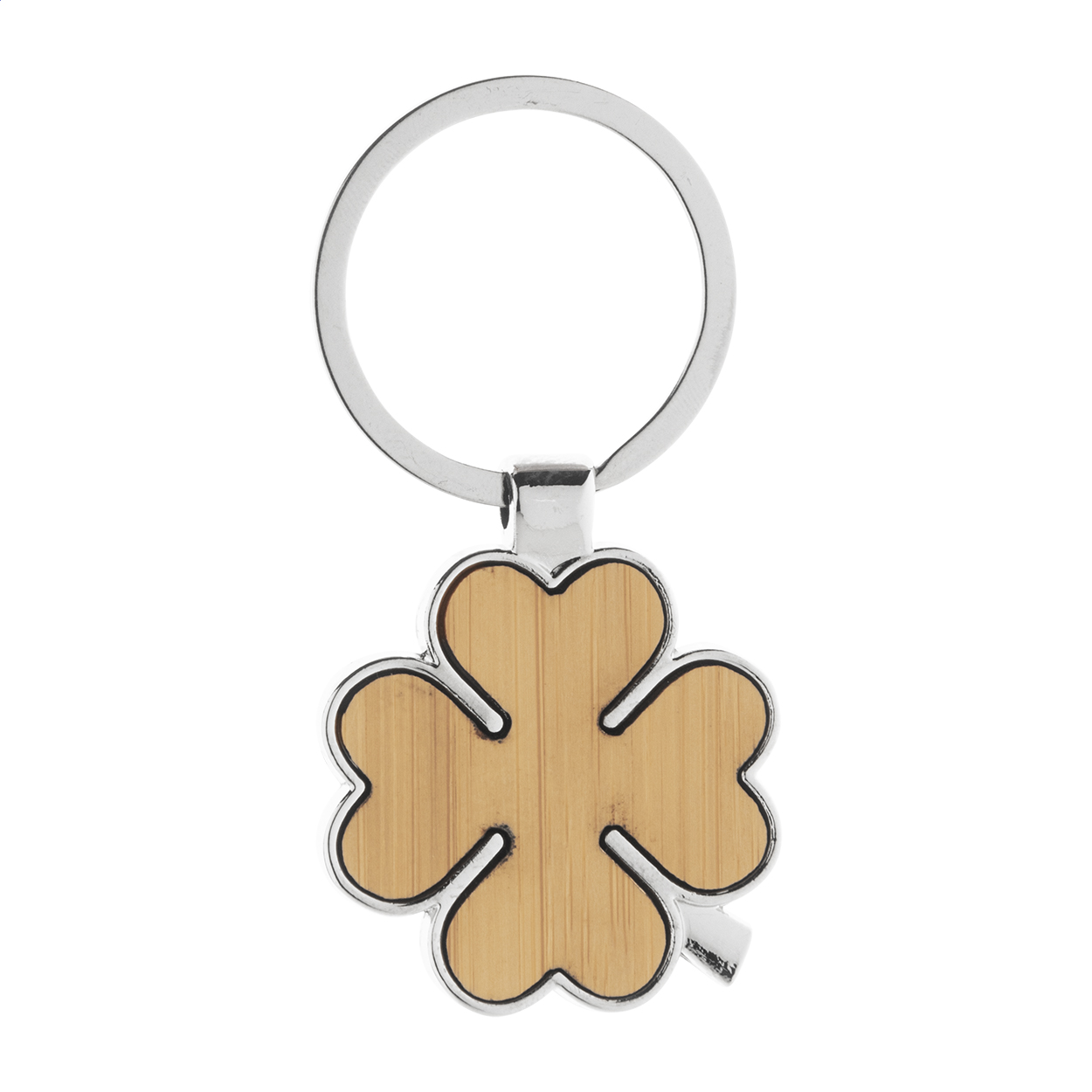 Portachiavi in metallo a forma di quadrifoglio con inserto in bambù. Fornito in scatola di cartoncino kraft.