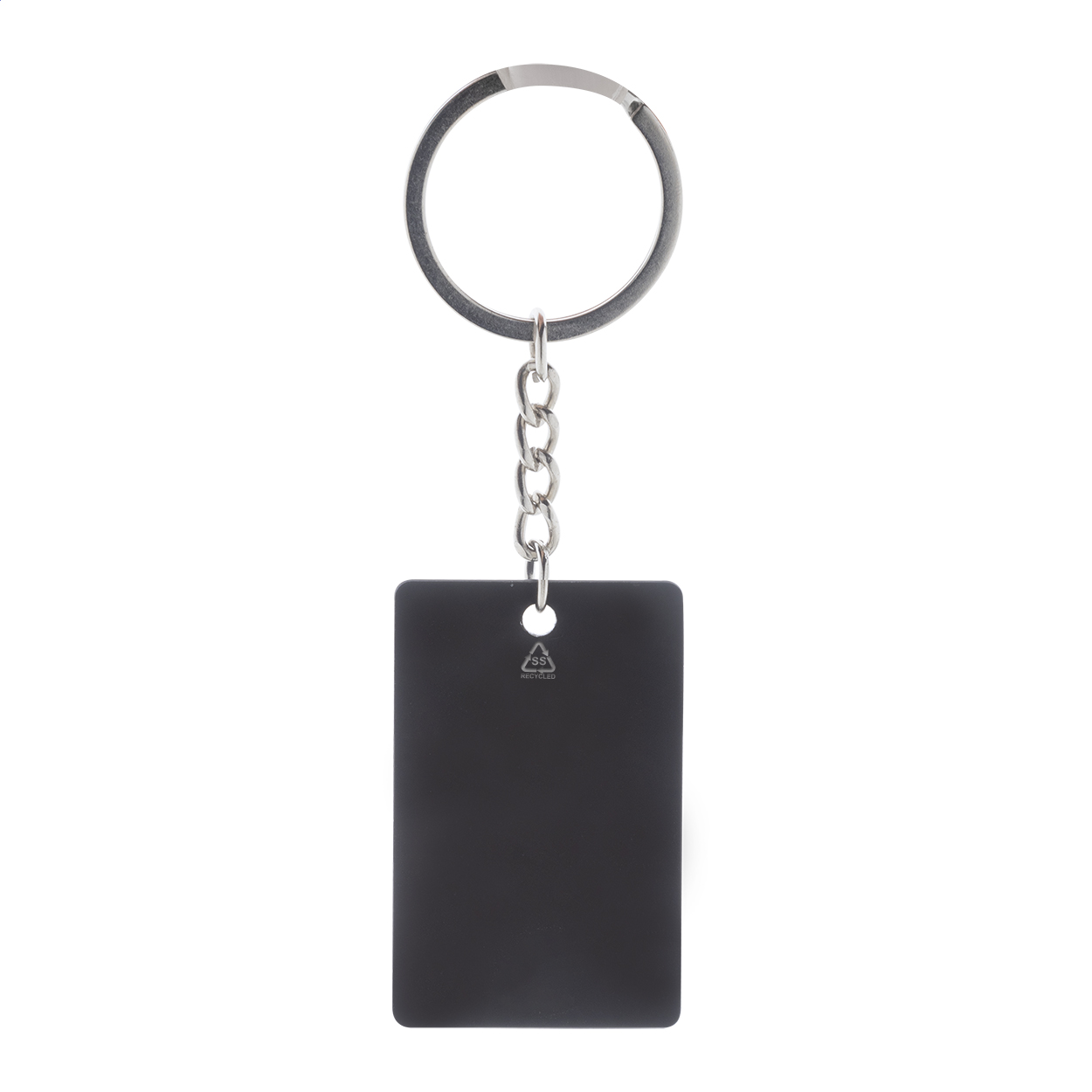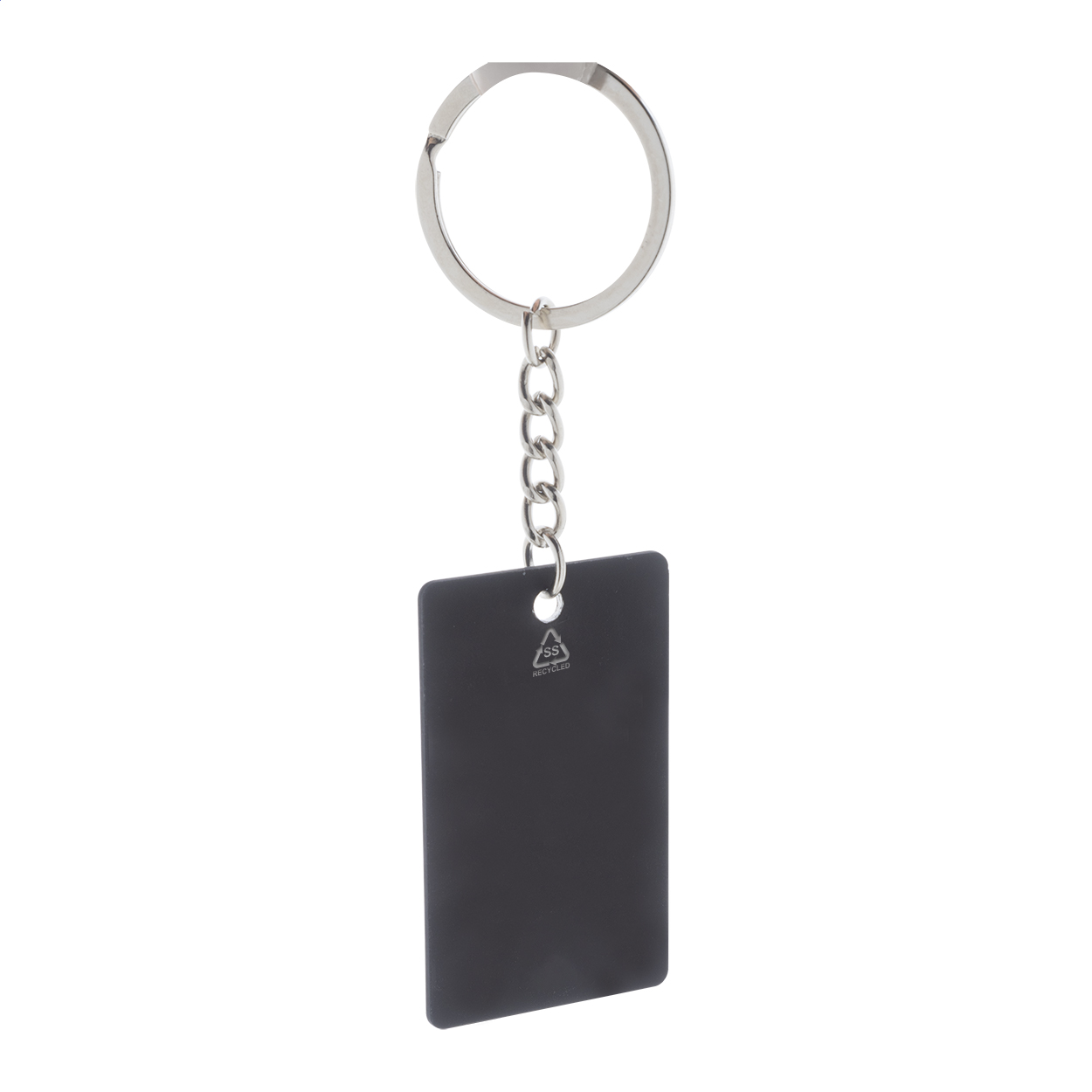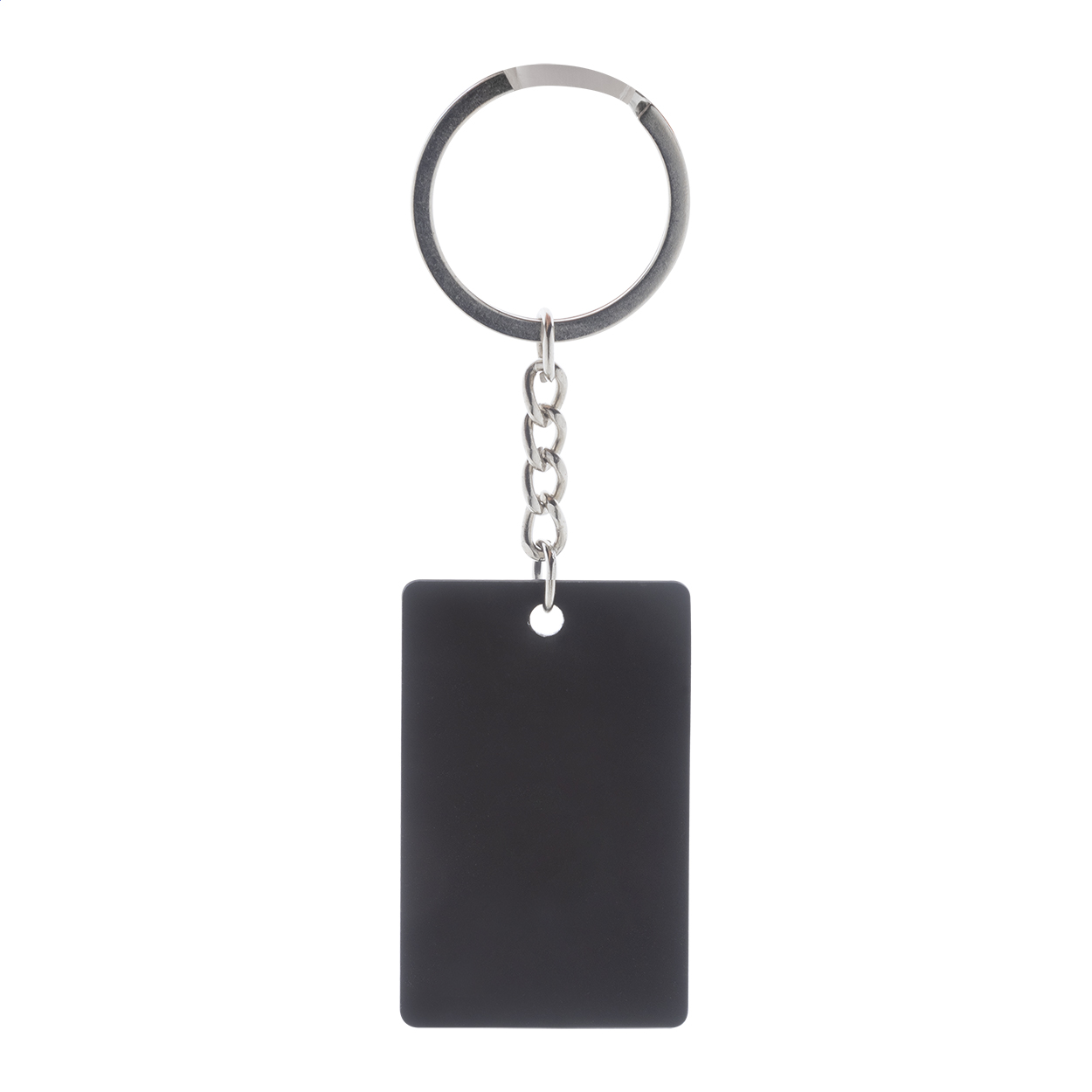 Portachiavi in acciaio riciclato a forma di rettangolo con finitura gommata. Trattamento speciale che permette l'incisione laser a specchio.