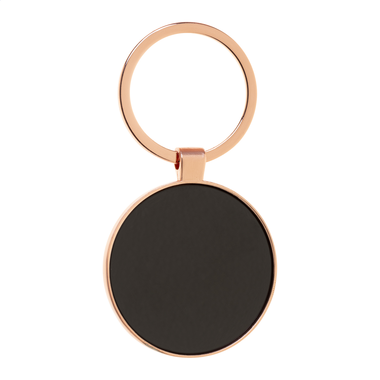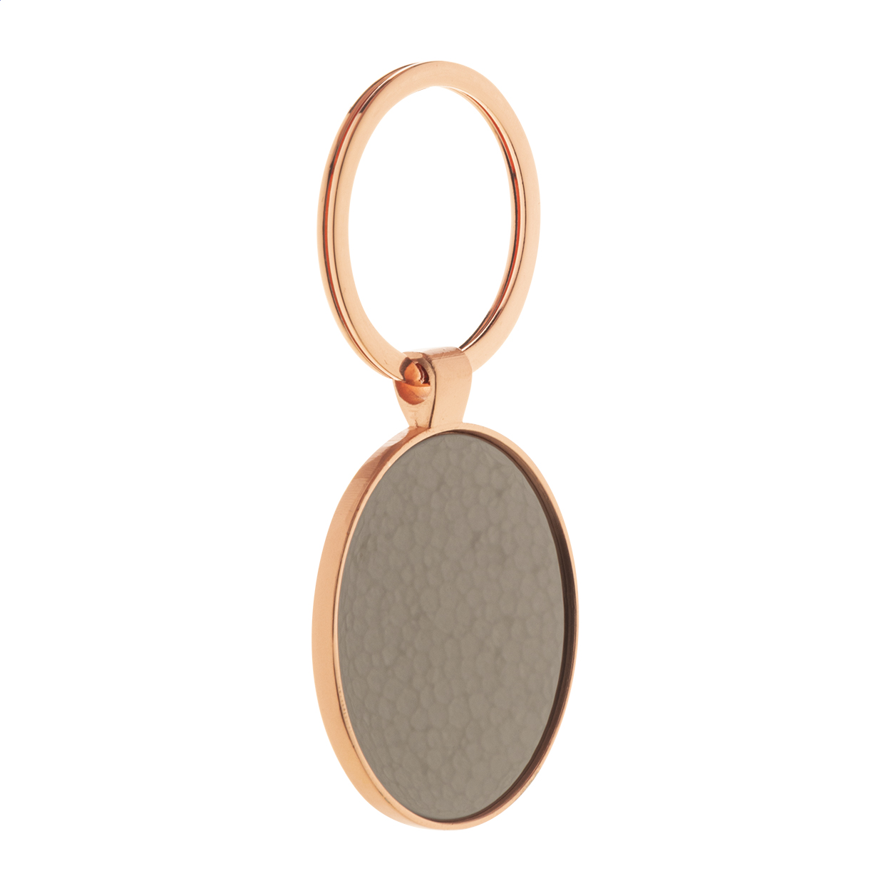 Portachiavi ovale in metallo con finitura dorata e placca color canna di fucile. Confezione in scatola di cartoncino kraft.