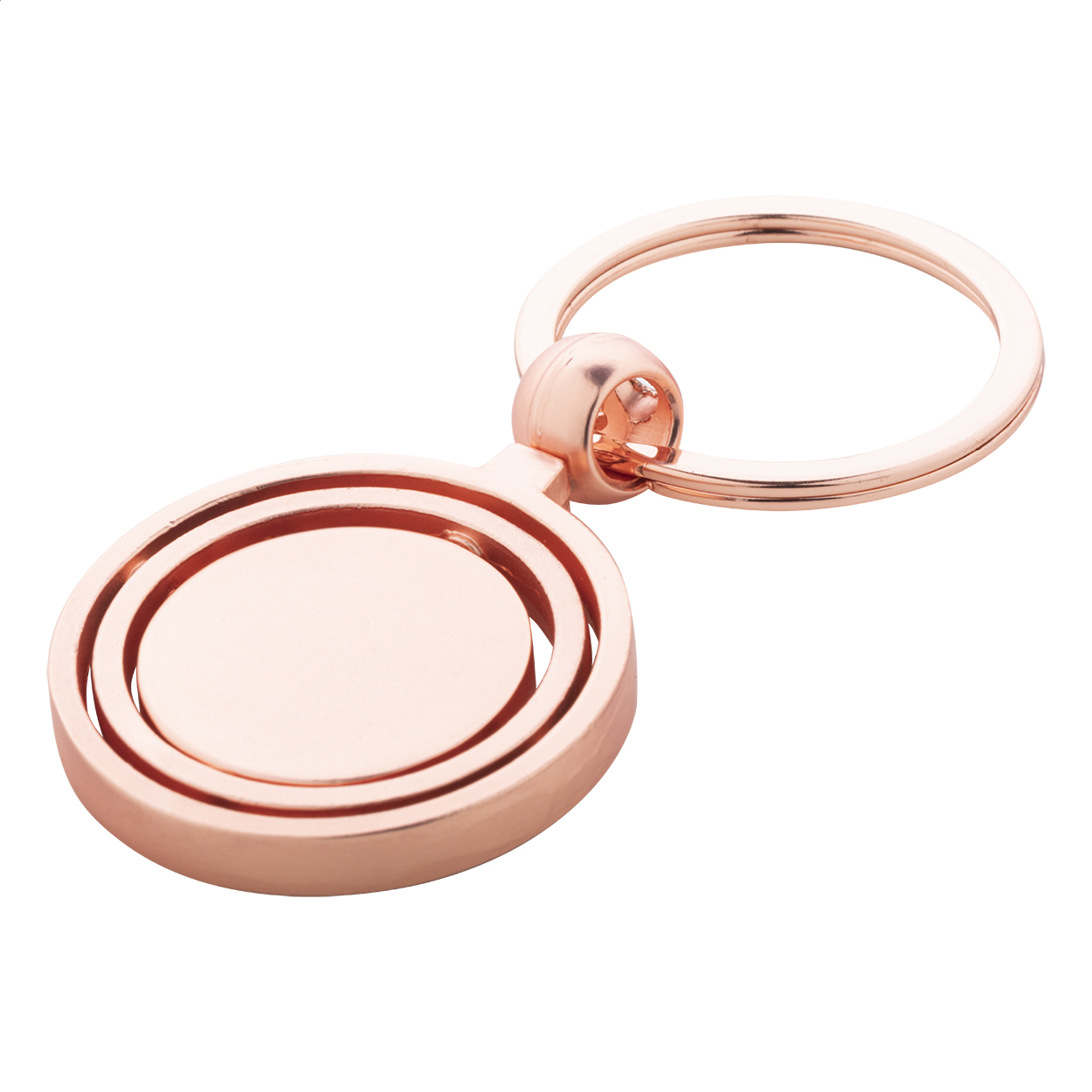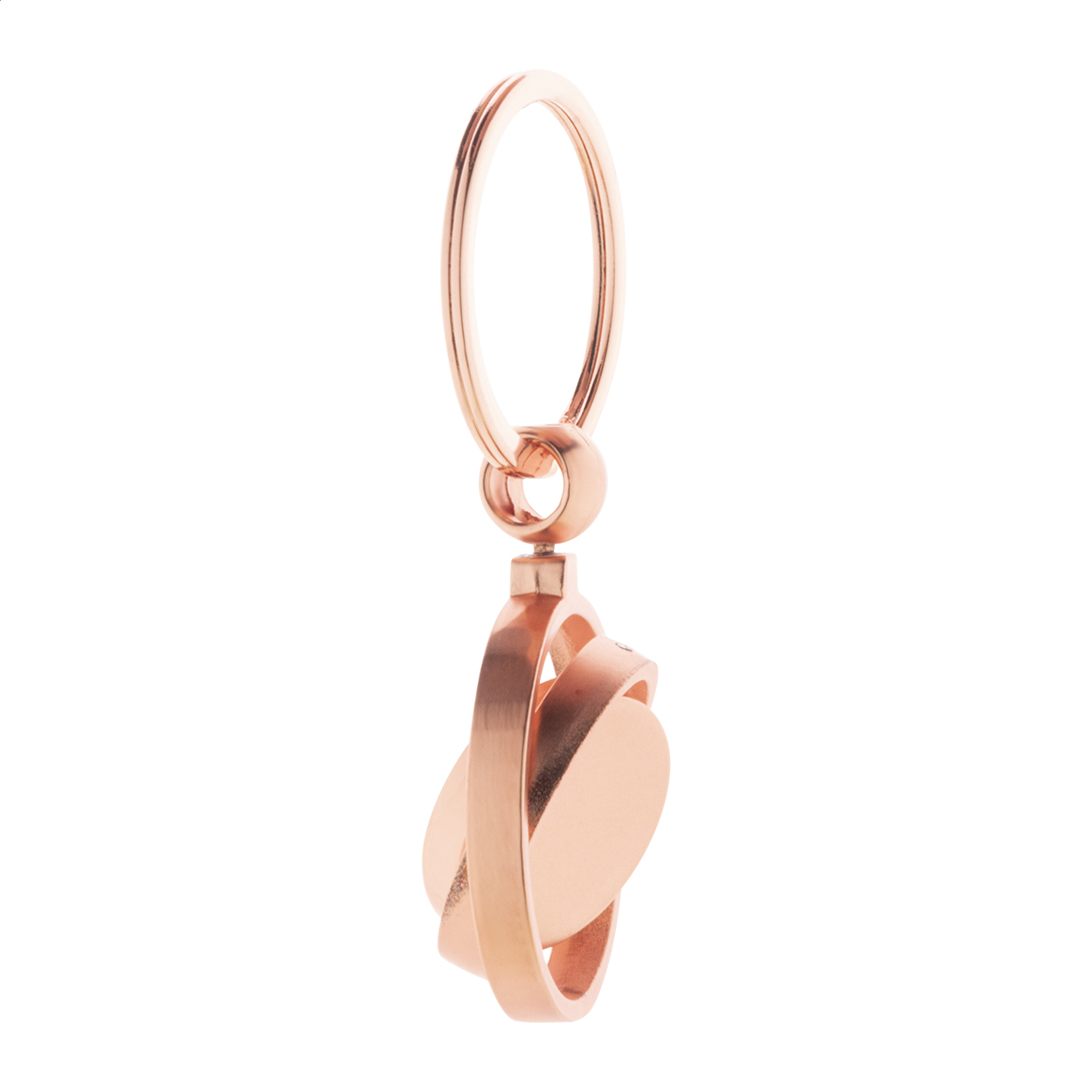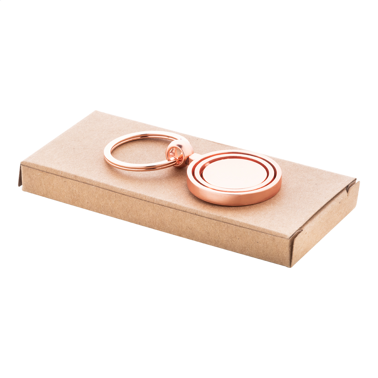 Portachiavi in metallo con finitura dorata e parte interna ruotabile. Confezione in scatola di cartoncino kraft.