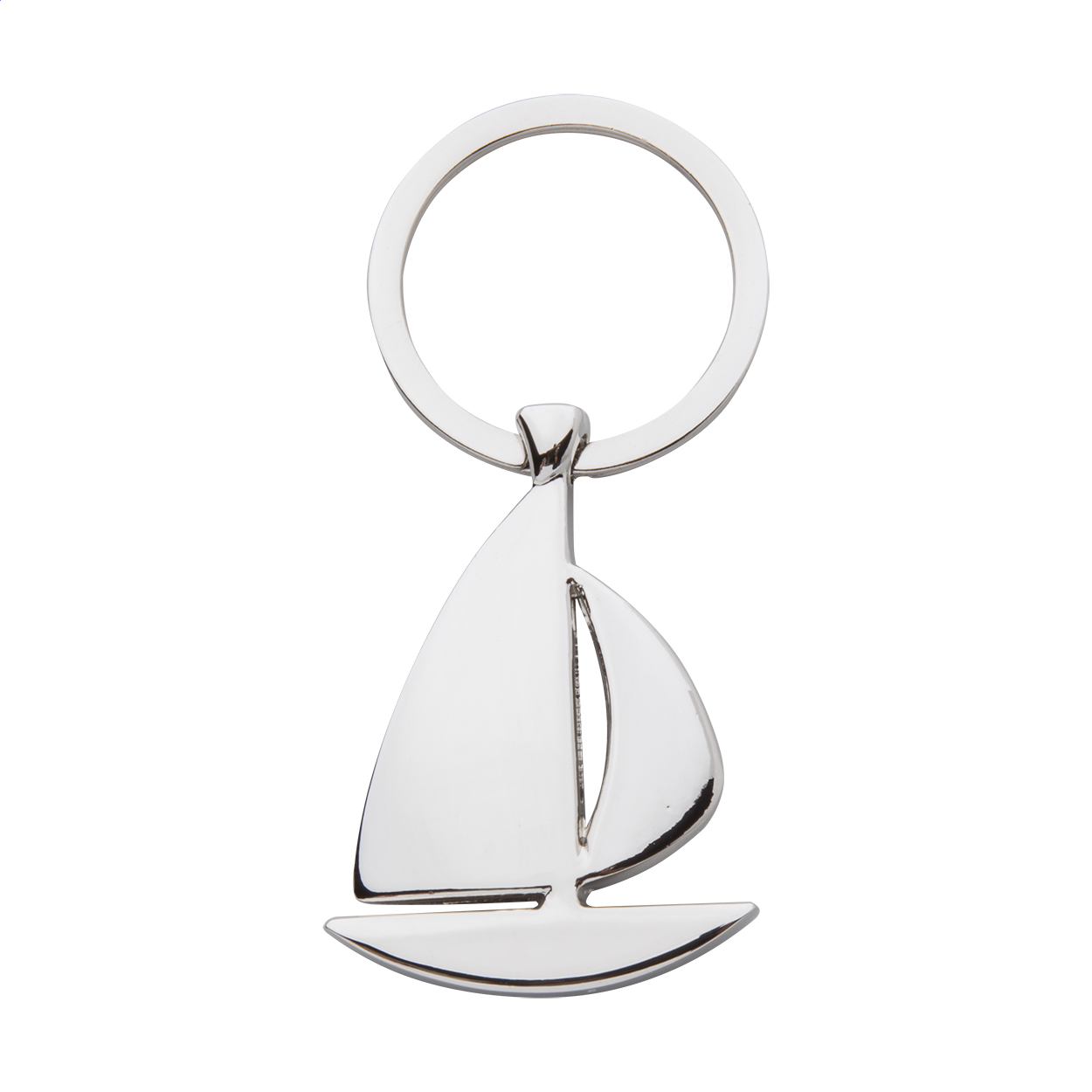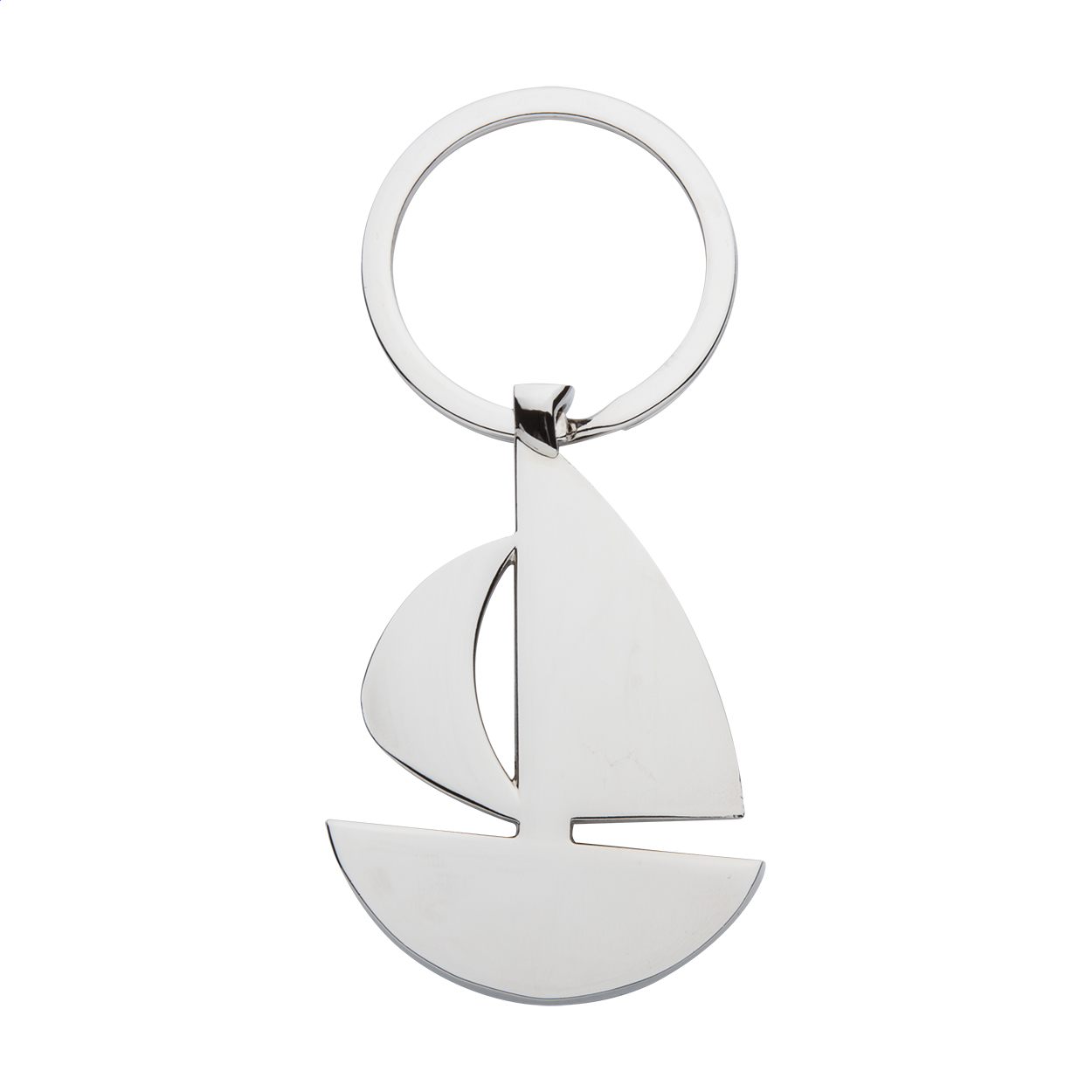 Portachiavi in metallo a forma di nave in confezione di cartone nera.