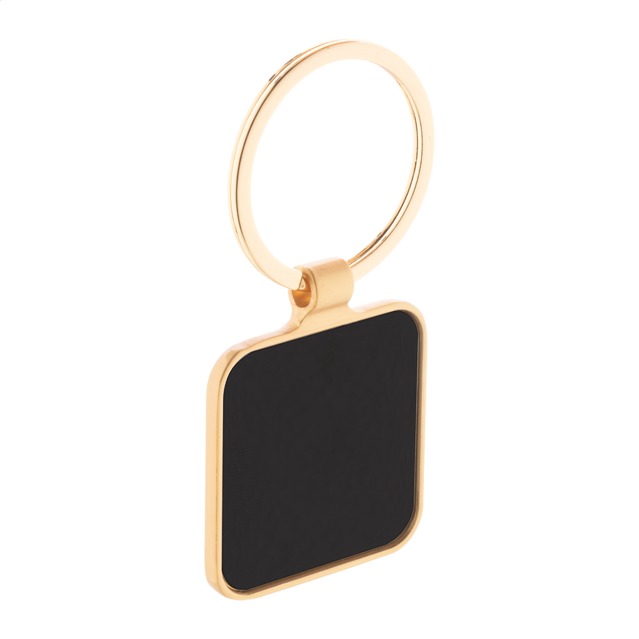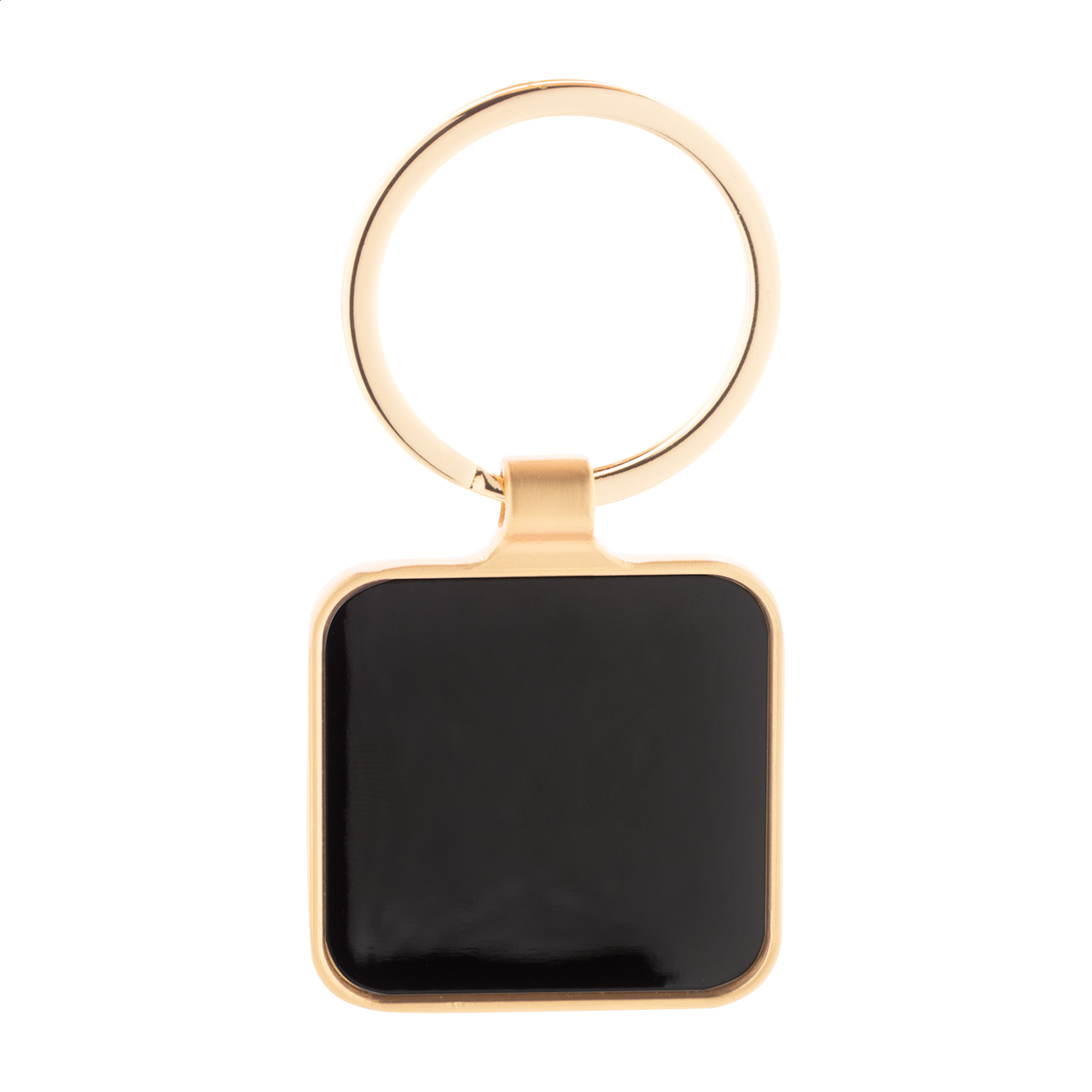 Portachiavi quadrato in metallo con finitura dorata e placca color canna di fucile. Confezione in scatola di cartoncino kraft.