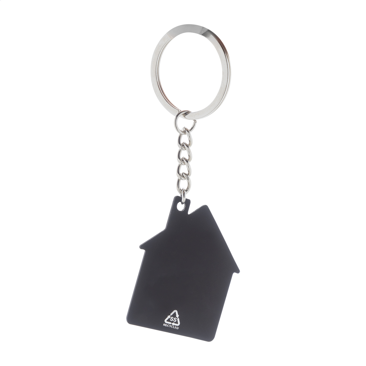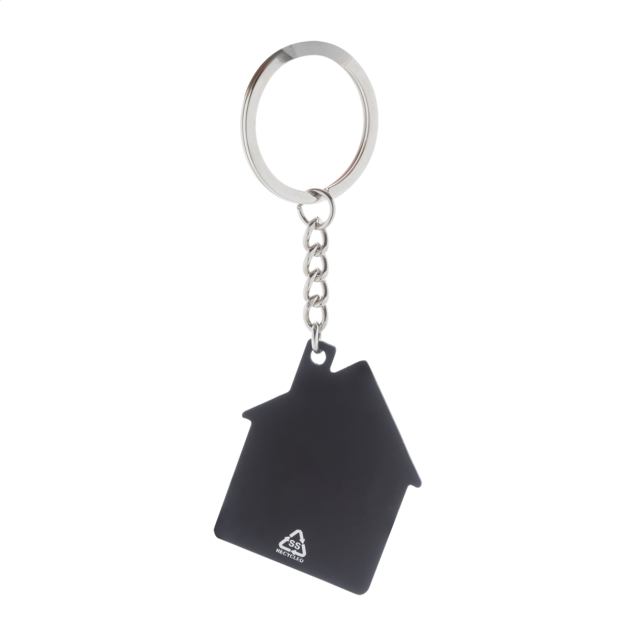 Portachiavi in acciaio riciclato a forma di casa con finitura gommata. Trattamento speciale che permette l'incisione laser a specchio.