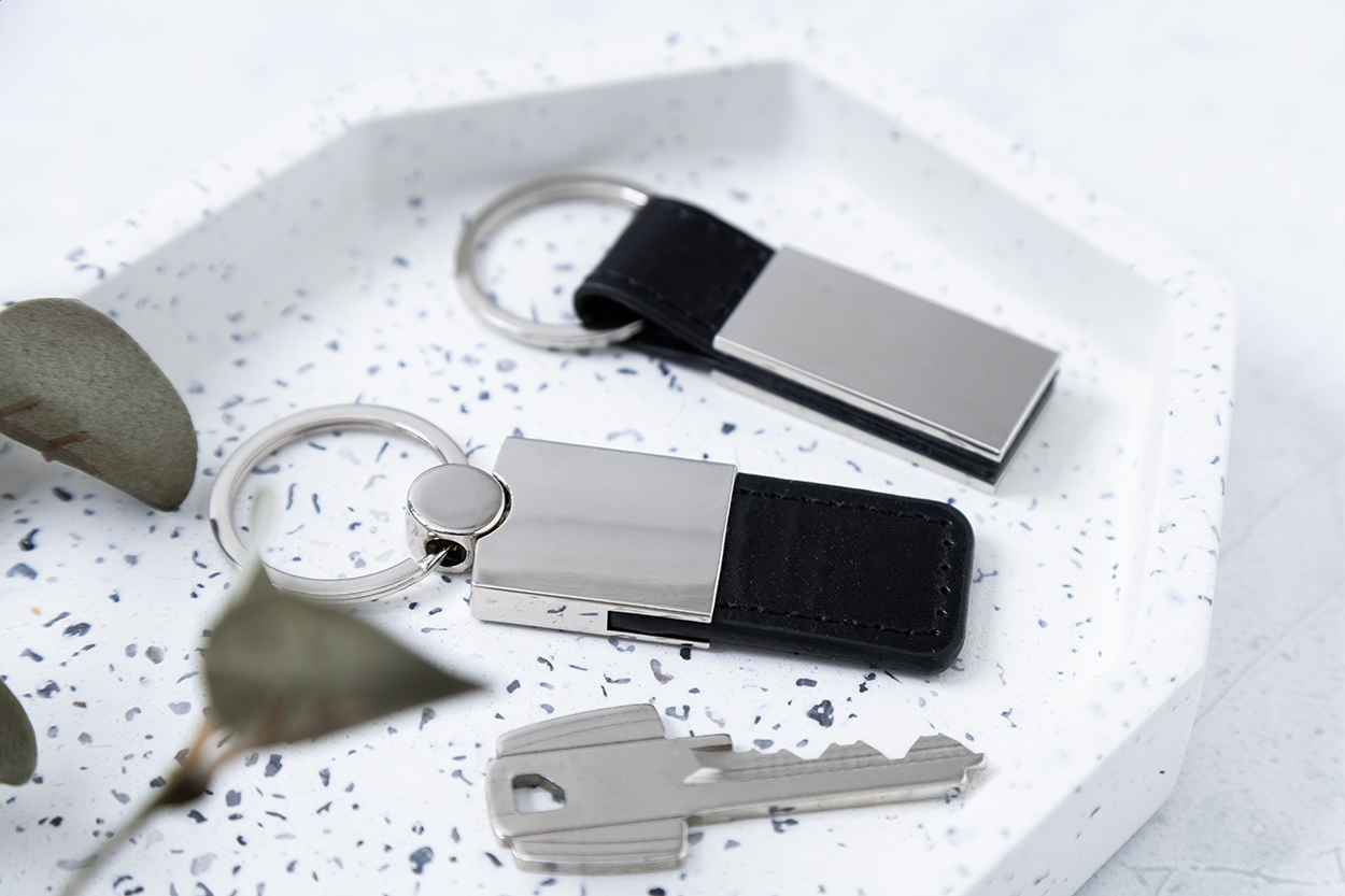 Portachiavi in metallo e pelle PU, fornito in scatola di cartoncino kraft.