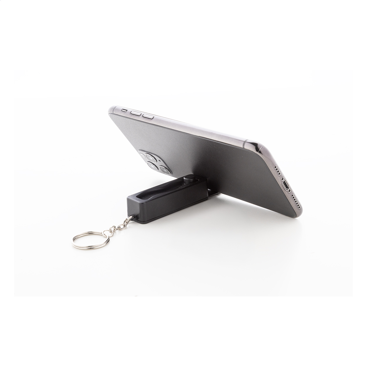 Portachiavi fidget toy in ABS riciclato antistress con portacellulare integrato e anello in metallo.