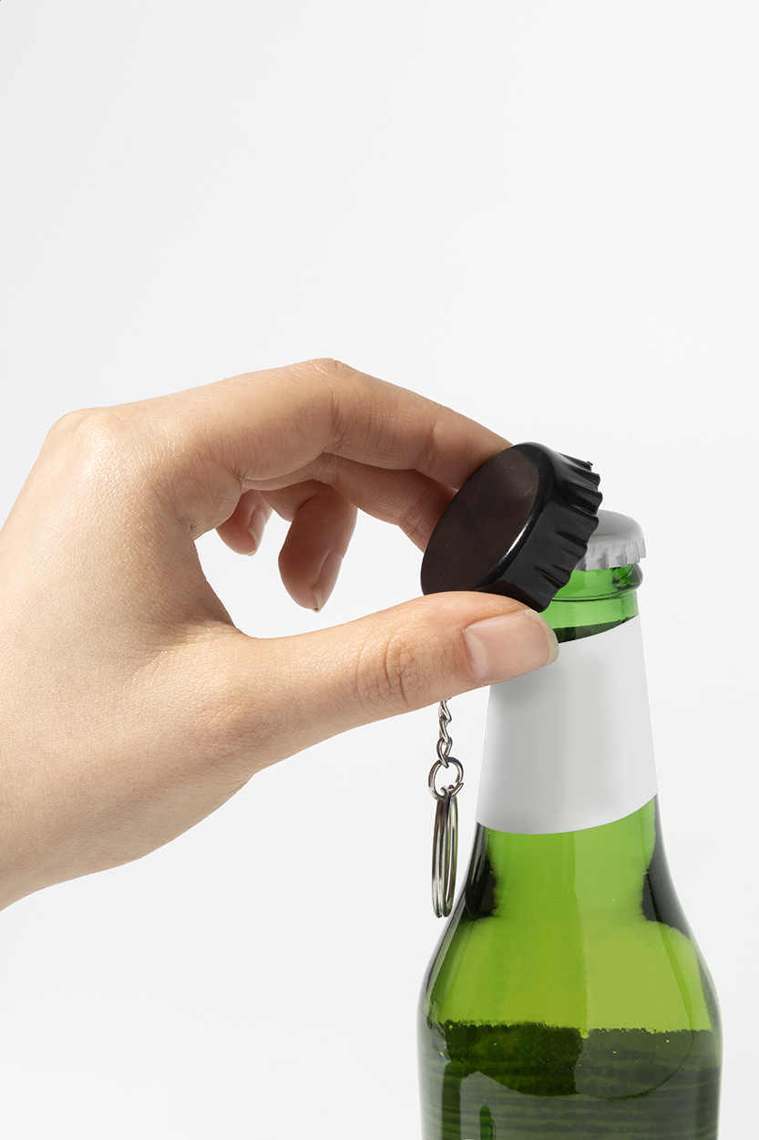 Portachiavi in ABS riciclato a forma di tappo di bottiglia con apribottiglie.