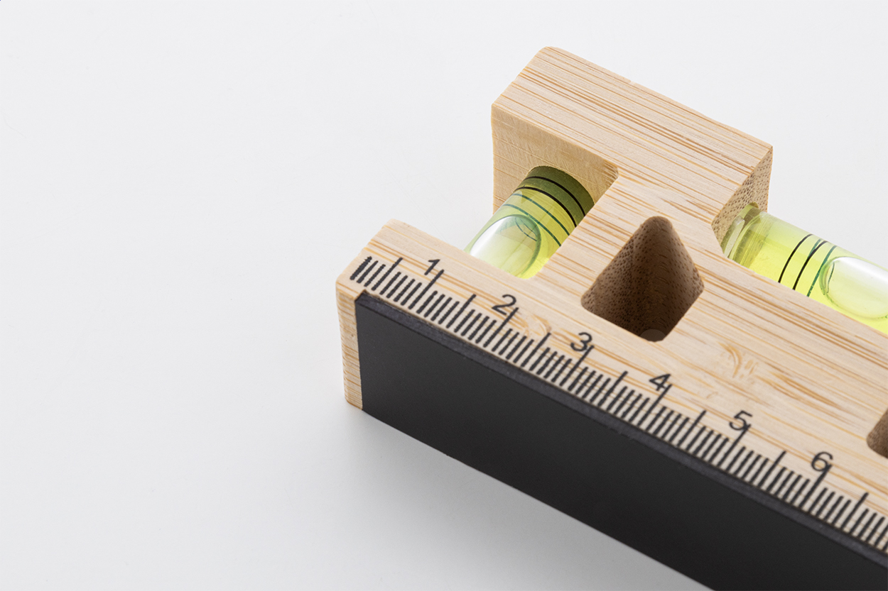 Portachiavi multifunzione in bambù con anello in metallo, righello, magnete e doppia livella.