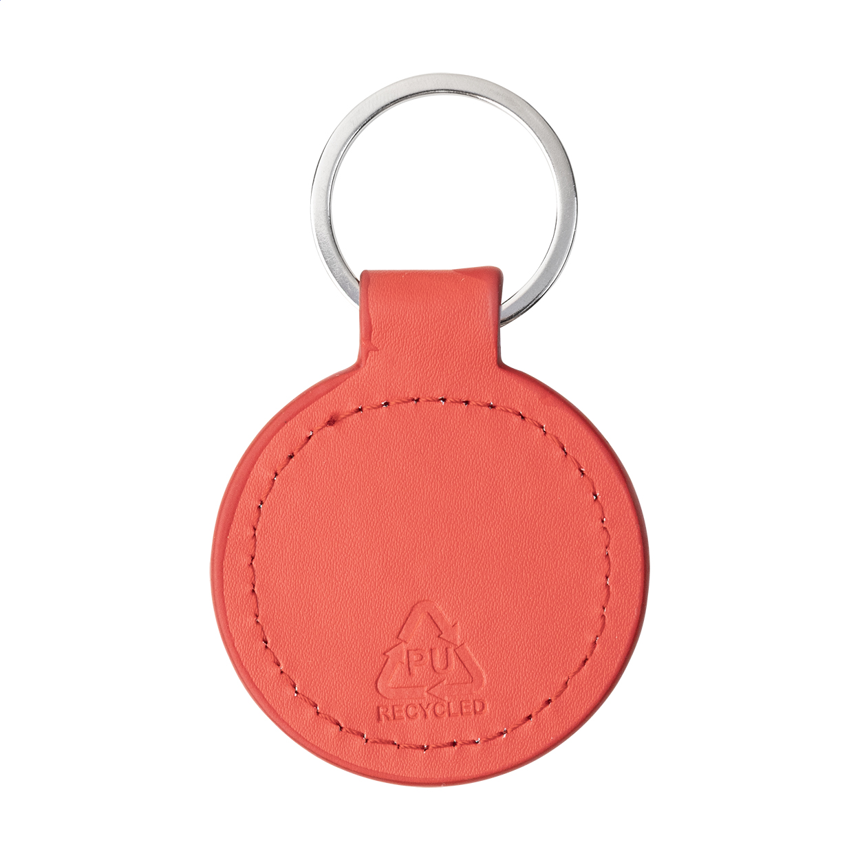 Portachiavi in pelle PU riciclata di forma rotonda con anello in metallo e targhetta logo in acciaio inox con finitura gommata. Speciale rivestimento per l'incisione laser a specchio.