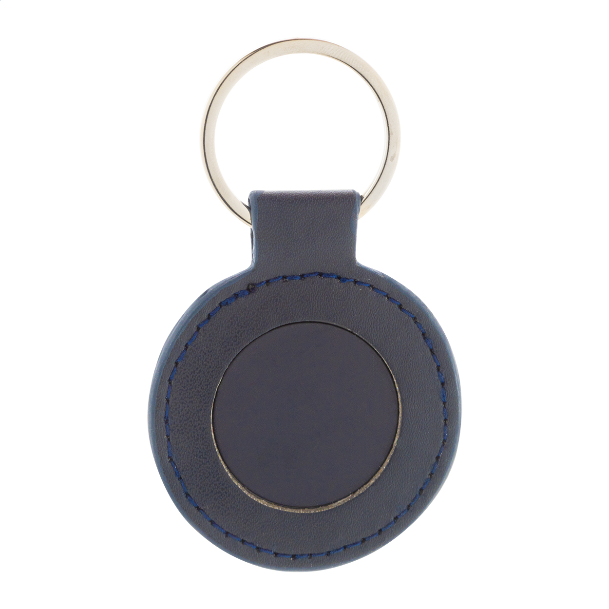Portachiavi in pelle PU riciclata di forma rotonda con anello in metallo e targhetta logo in acciaio inox con finitura gommata. Speciale rivestimento per l'incisione laser a specchio.