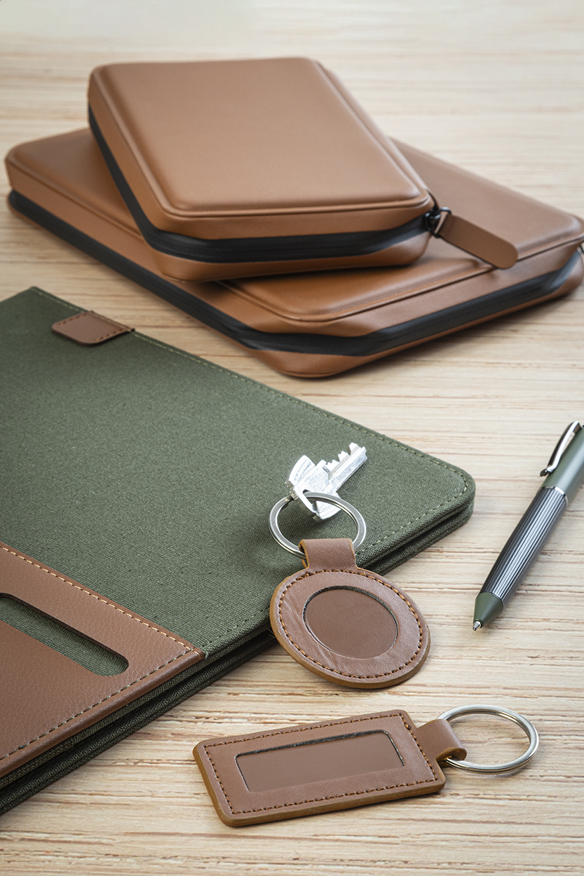 Portachiavi in pelle PU riciclata di forma rotonda con anello in metallo e targhetta logo in acciaio inox con finitura gommata. Speciale rivestimento per l'incisione laser a specchio.