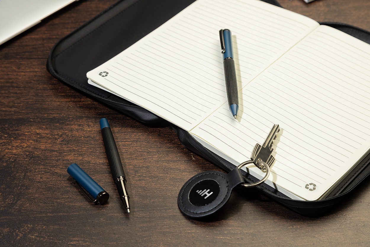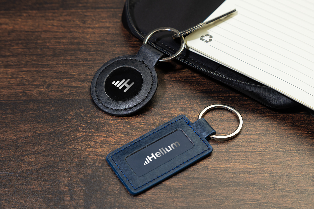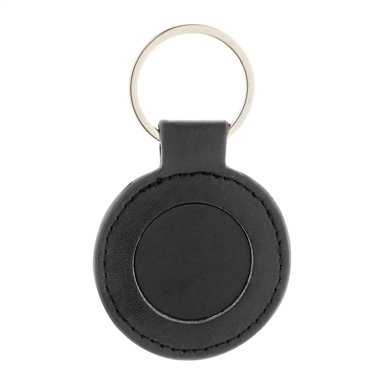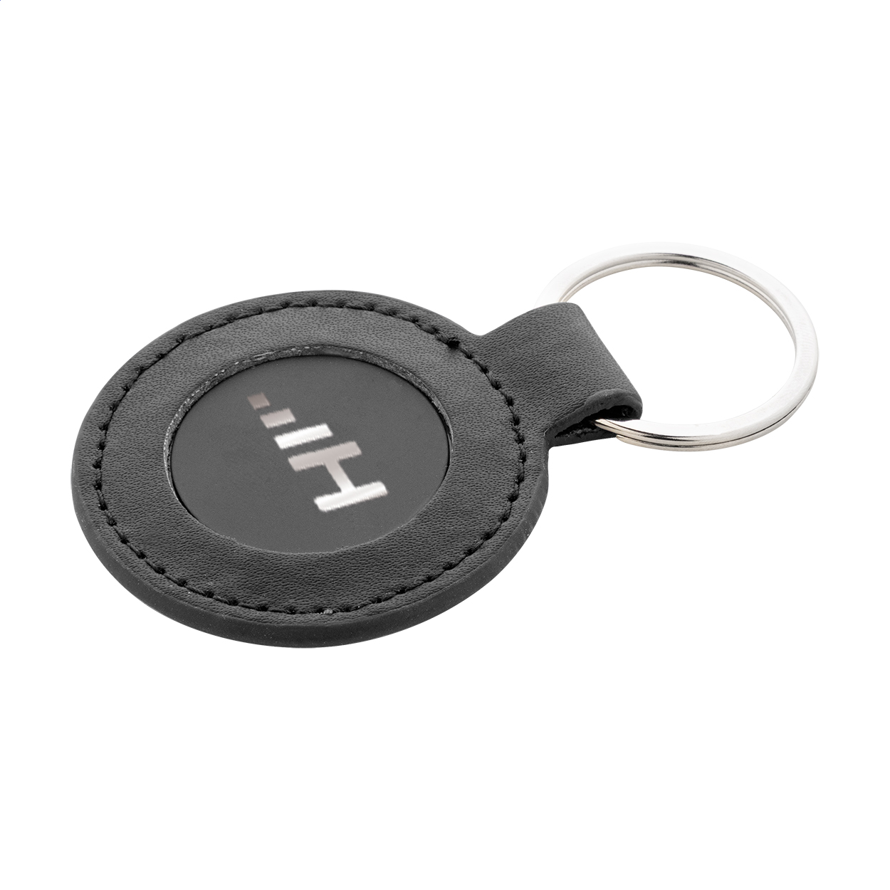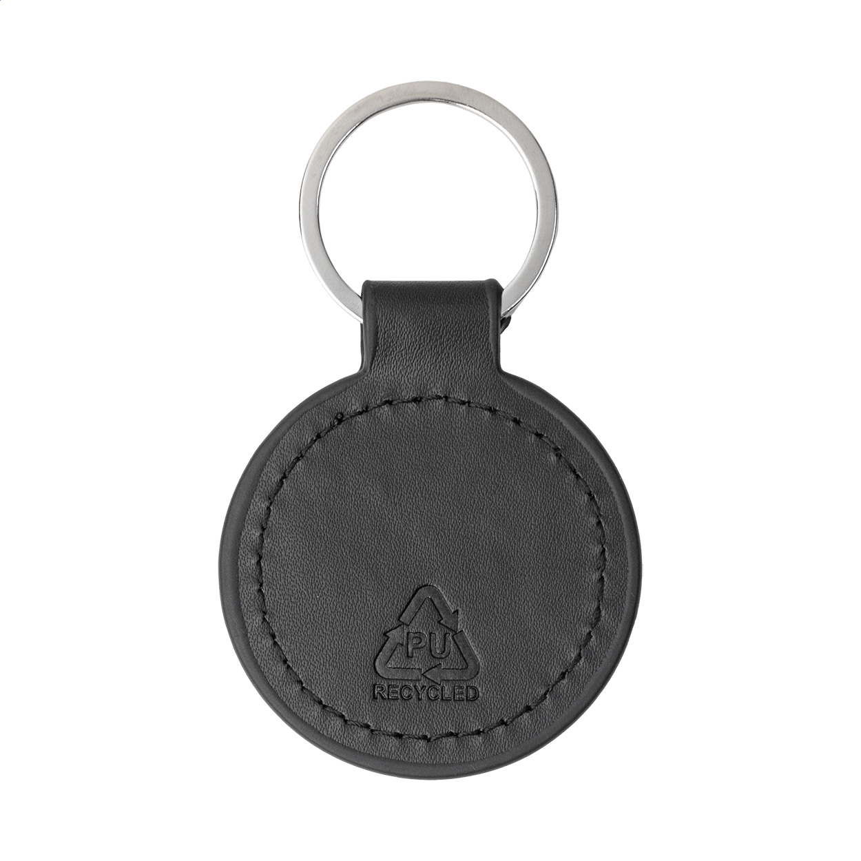 Portachiavi in pelle PU riciclata di forma rotonda con anello in metallo e targhetta logo in acciaio inox con finitura gommata. Speciale rivestimento per l'incisione laser a specchio.