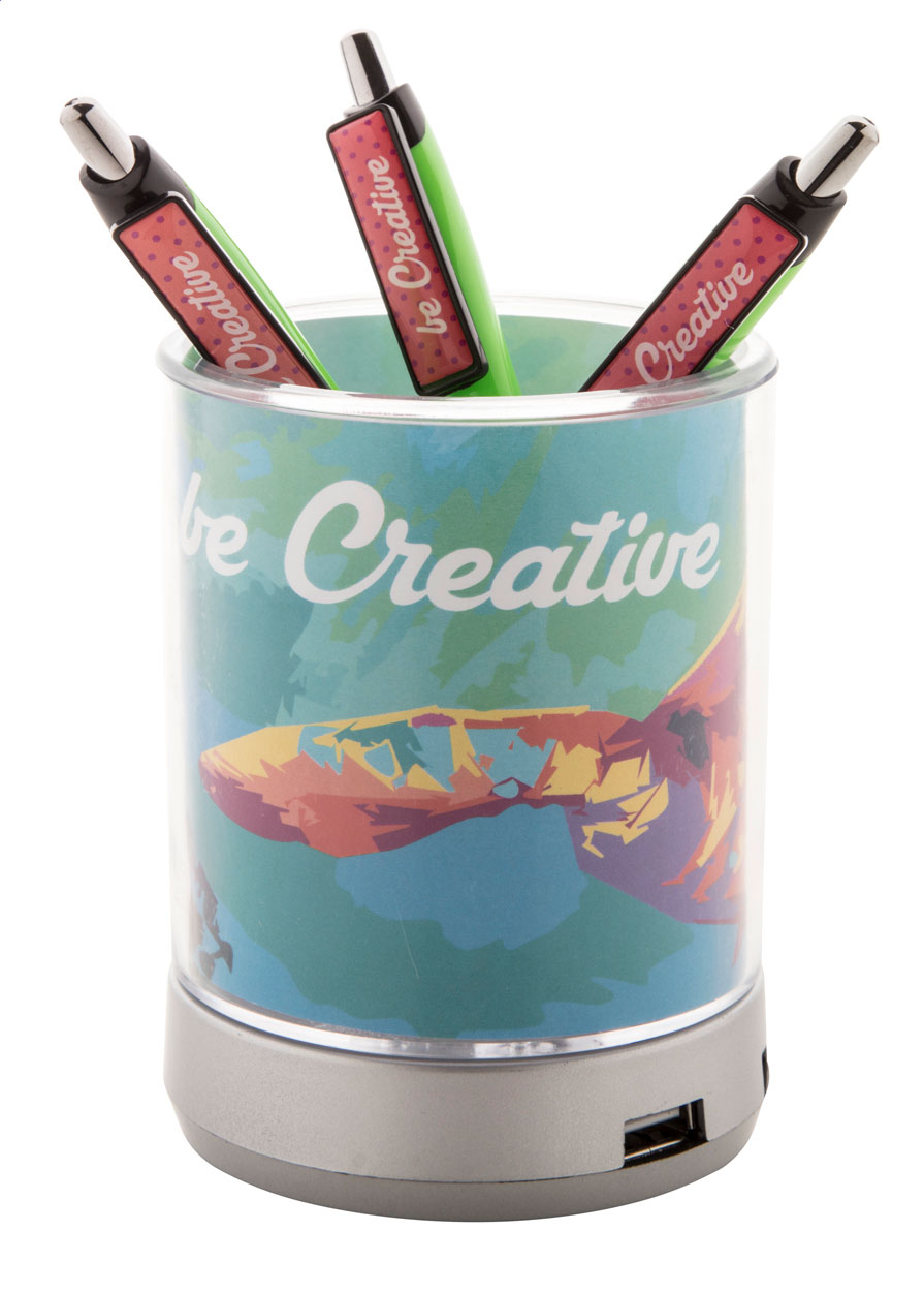 Portapenne da tavolo con HUB USB 4 porte con luce azzurra alla connessione. USB 2.0. Materiale: ABS. Grafica personalizzata.