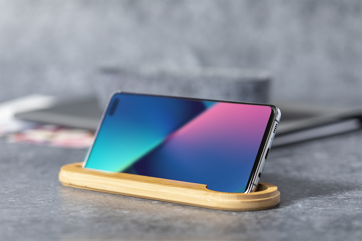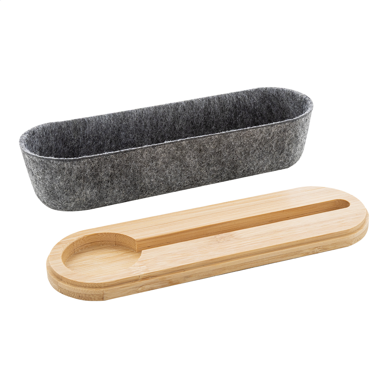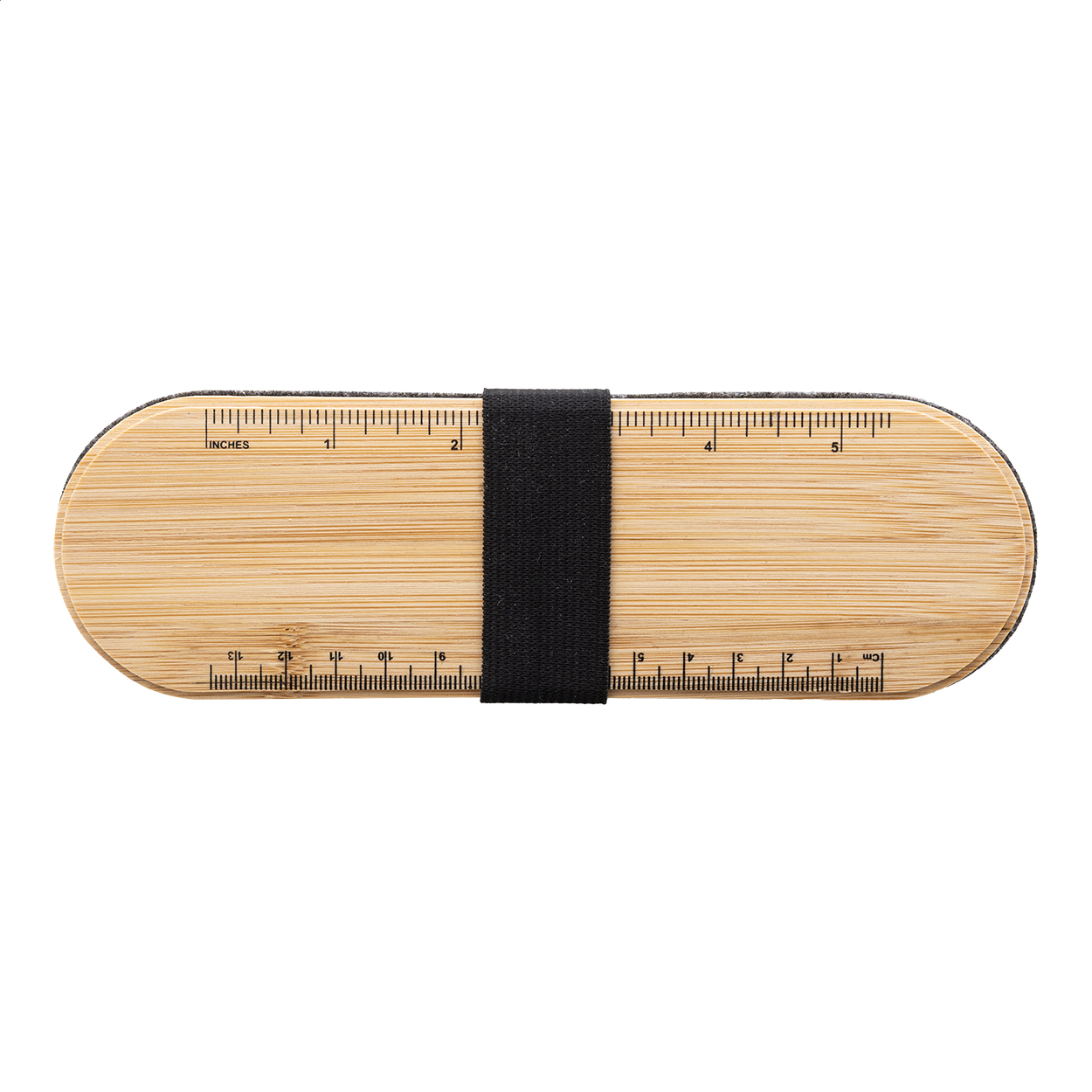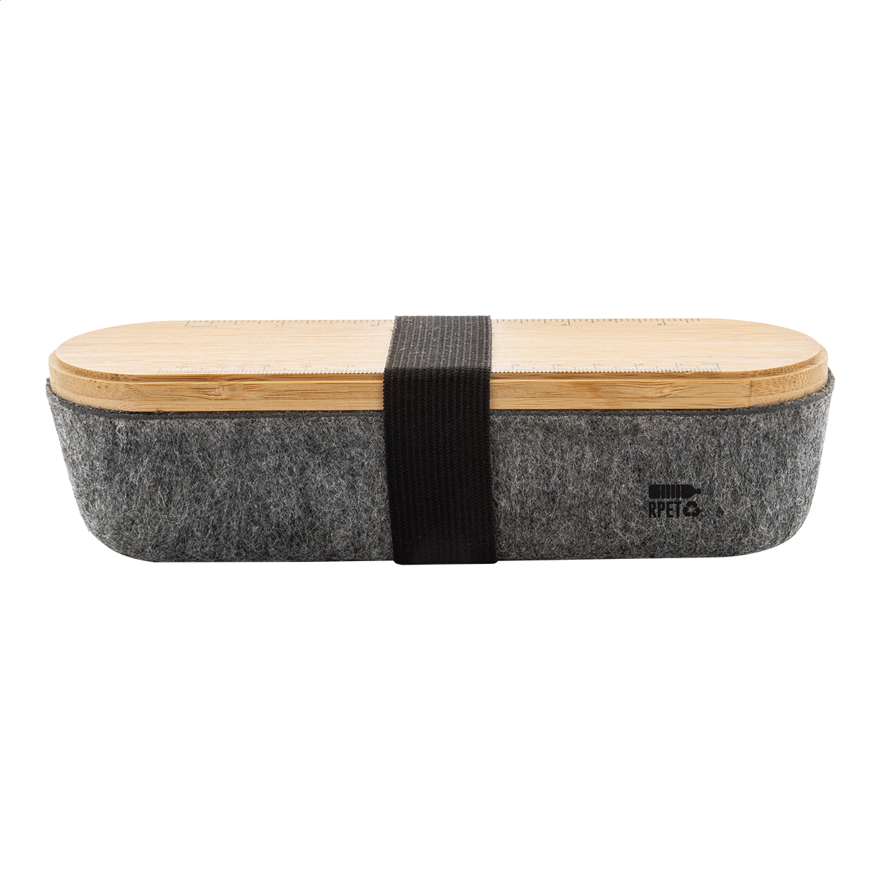 Portapenne in feltro RPET con coperchio in bambù completo di riga, portacellulare integrato ed elastico di chiusura.