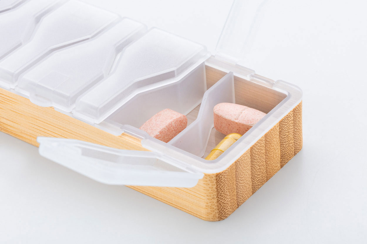 Portapillole settimanale in bambù e plastica PP, con 7 scomparti.