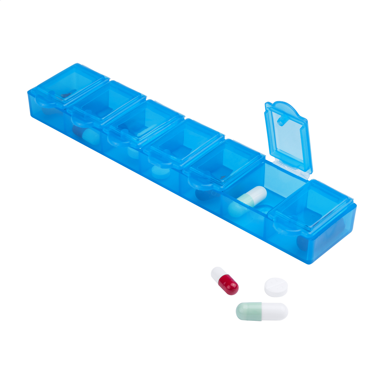 Portapillole settimanale in plastica con 7 scomparti.