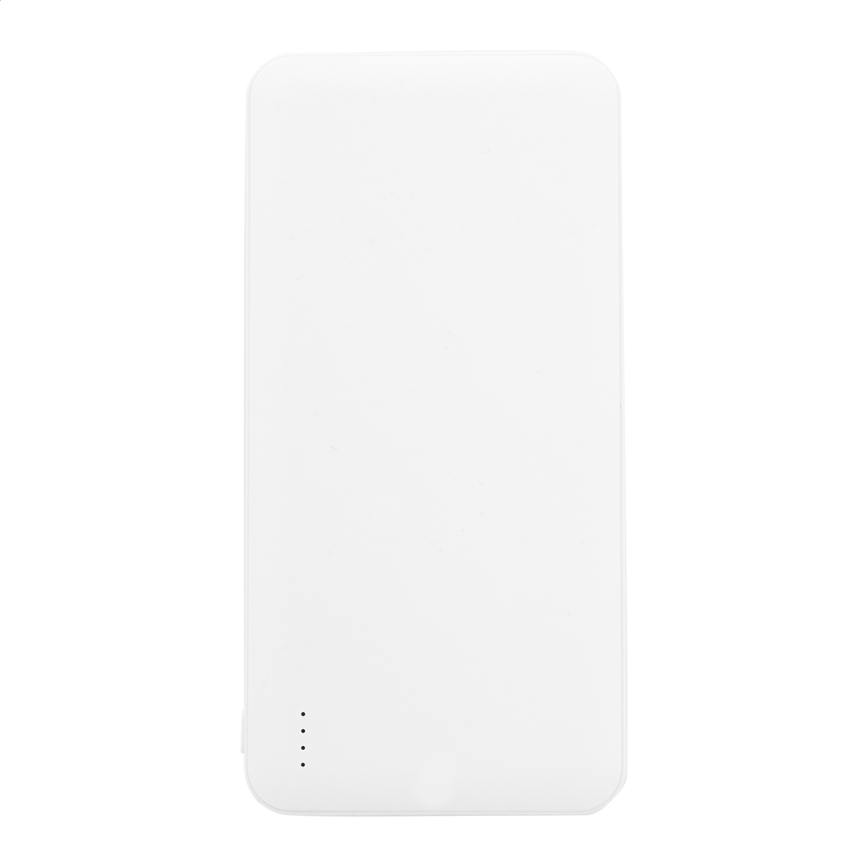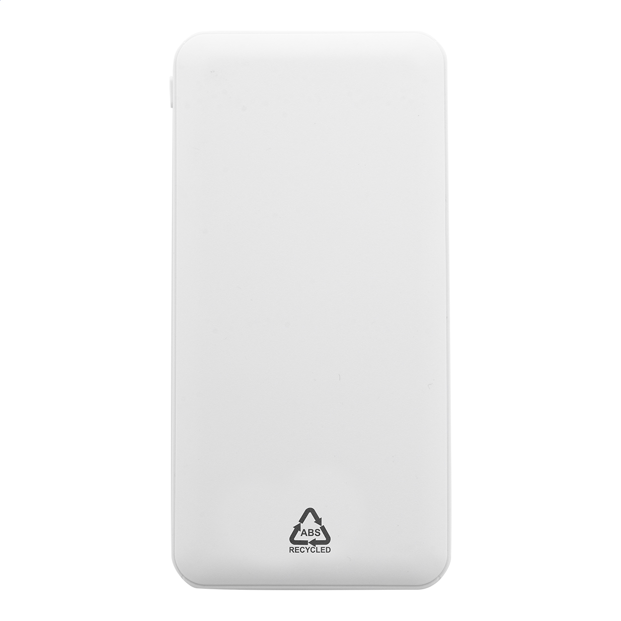 Power bank in plastica ABS riciclata con batteria da 10000 mAh. Con 2 porte di ricarica USB e 1 USB-C e porte di ingresso micro USB e USB-C. Cavo di ricarica USB incluso.