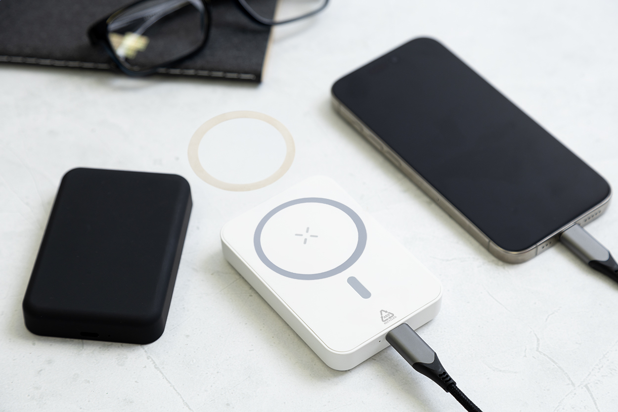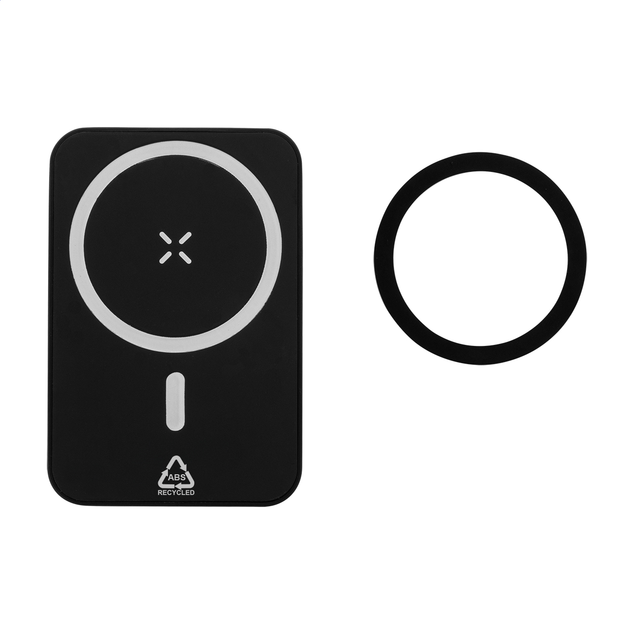 Power bank in ABS riciclato con batteria da 5000 mAh, caricatore wireless magnetico integrato (5W) ed ingresso e porta di ricarica USB-C. Viene compreso un anello metallico autoadesivo che consente di utilizzare la funzione magnetica su qualsiasi dispositivo ricaricabile in modalità wireless. Compatibile con iPhone® 12 o più recente. Cavo di ricarica USB incluso.