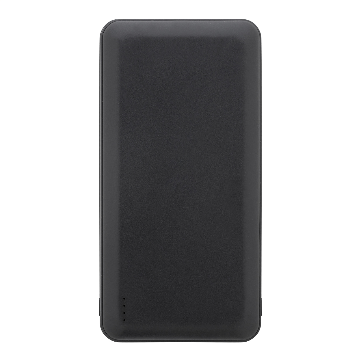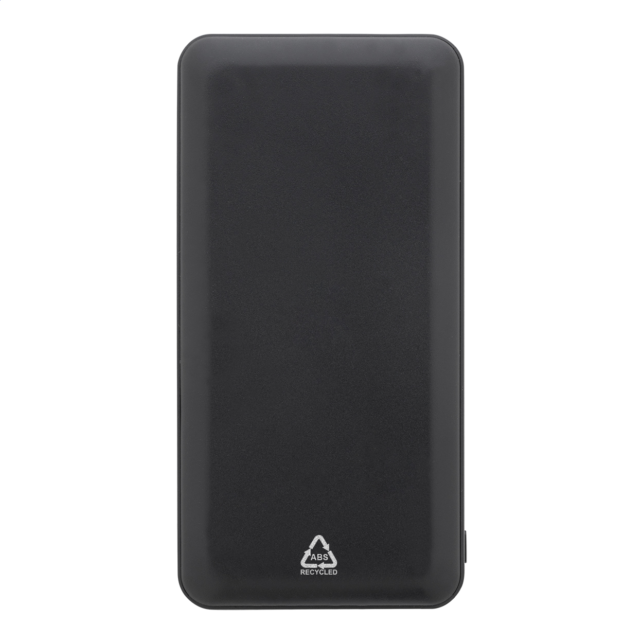 Power bank in ABS riciclato con batteria da 20000 mAh.,2 porte di ricarica USB e 1 USB-C e porte di ingresso micro USB e USB-C. Cavo di ricarica USB incluso.