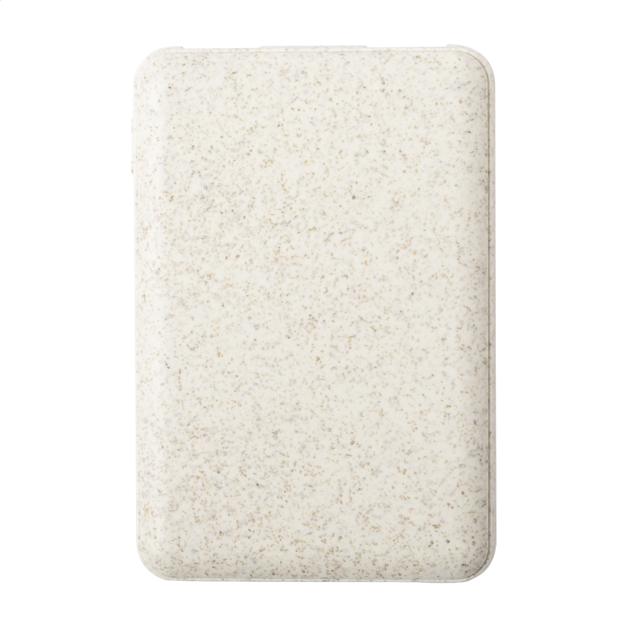Power bank, corpo in plastica ecologica di paglia di grano con batteria 5000 mAh e 2 uscite USB. Cavo di ricarica micro USB incluso.