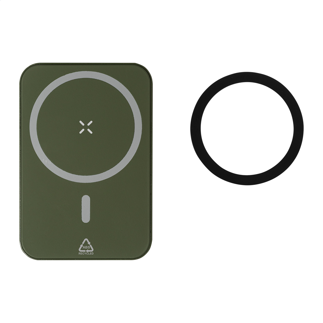 Power bank in ABS riciclato con batteria da 5000 mAh, caricatore wireless magnetico integrato (5W) ed ingresso e porta di ricarica USB-C. Viene compreso un anello metallico autoadesivo che consente di utilizzare la funzione magnetica su qualsiasi dispositivo ricaricabile in modalità wireless. Compatibile con iPhone® 12 o più recente. Cavo di ricarica USB incluso.