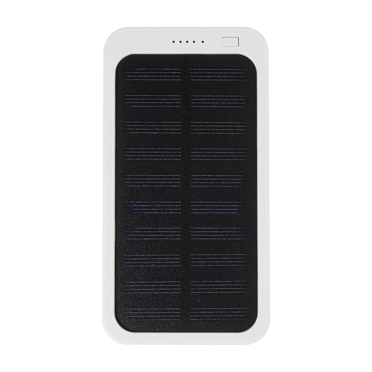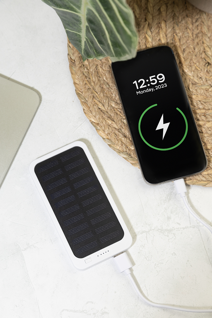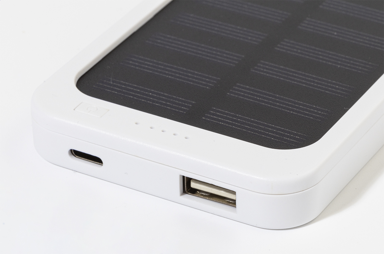 Power bank in ABS riciclato con caricatore solare integrato e batteria da 4000 mAh. Con 1 porta USB e 1 porta USB-C. Porta di ingresso USB-C. Cavo di ricarica USB incluso.