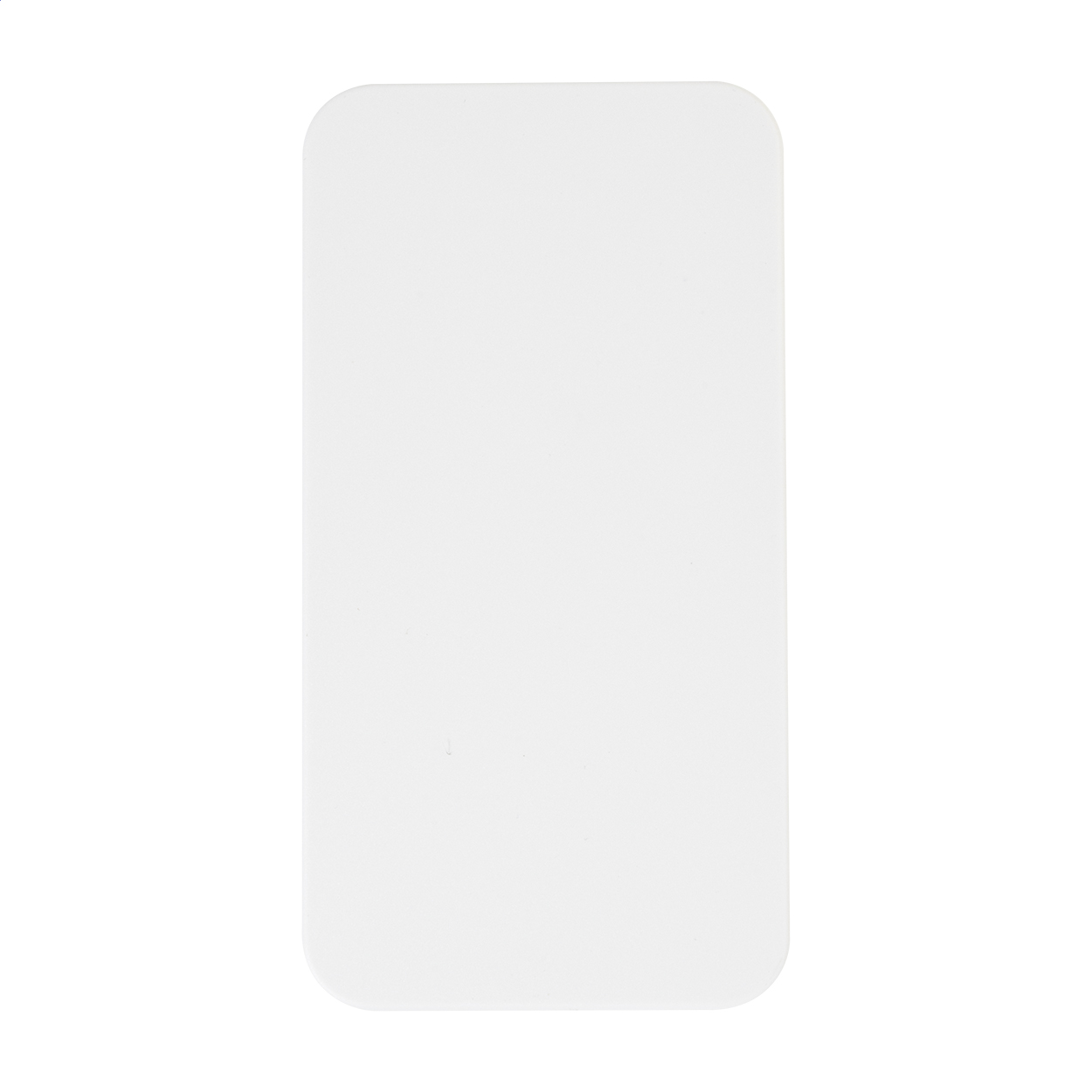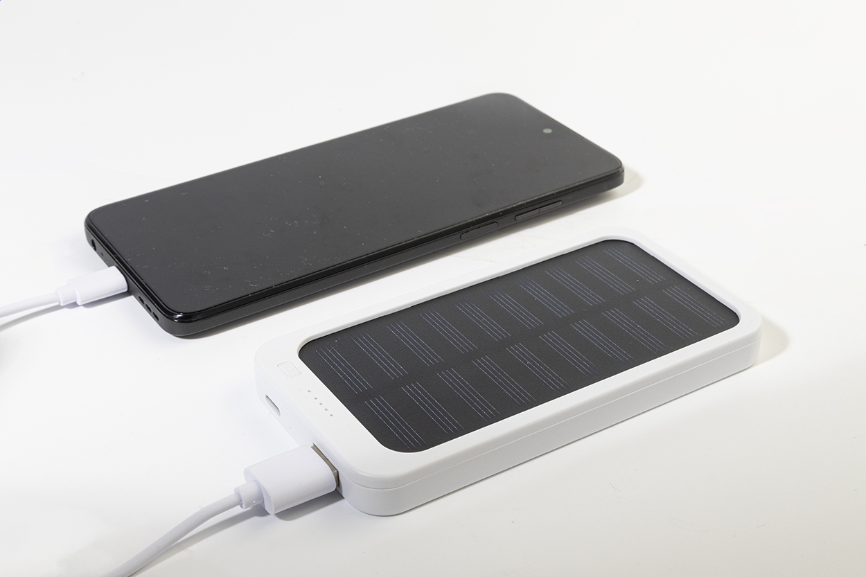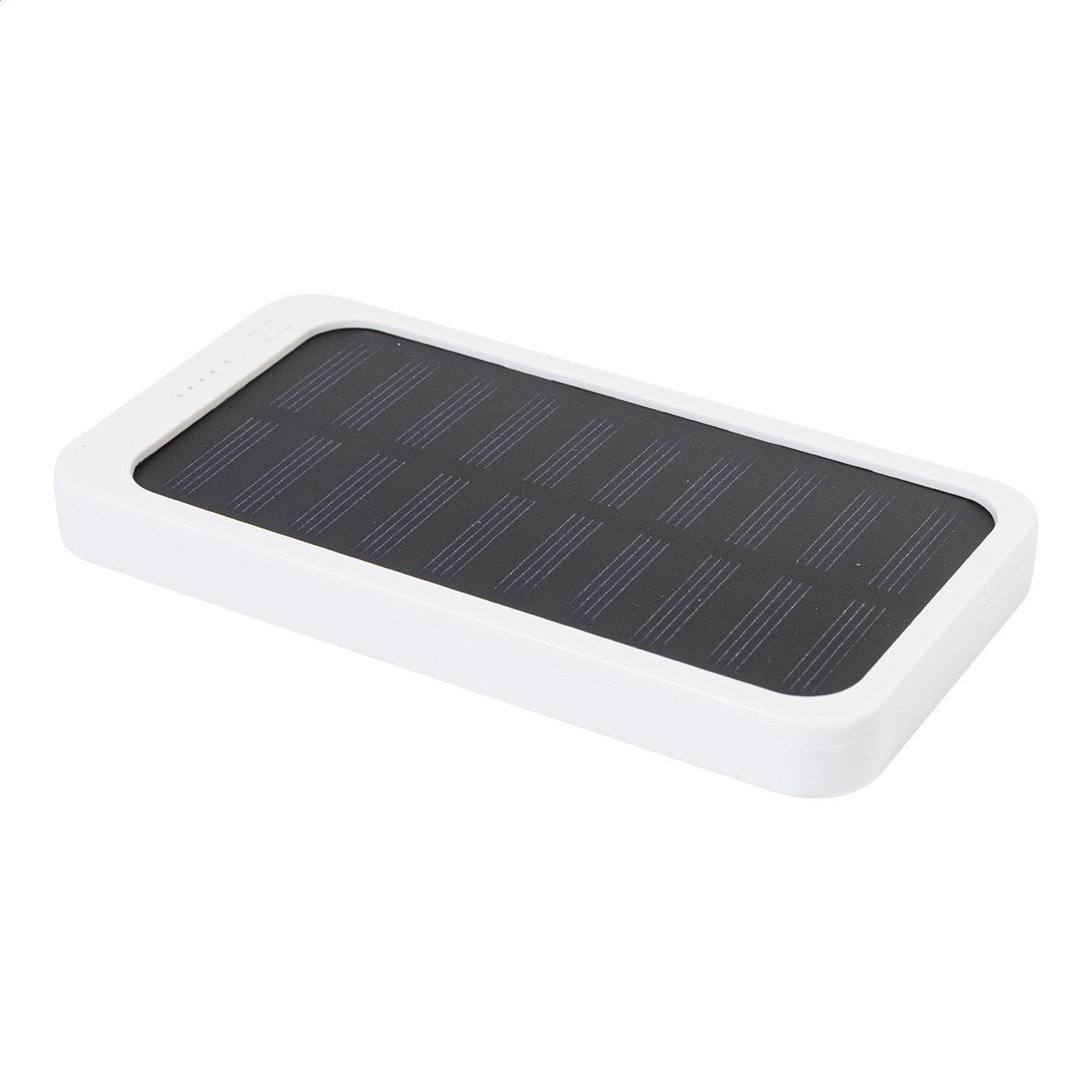 Power bank in ABS riciclato con caricatore solare integrato e batteria da 4000 mAh. Con 1 porta USB e 1 porta USB-C. Porta di ingresso USB-C. Cavo di ricarica USB incluso.