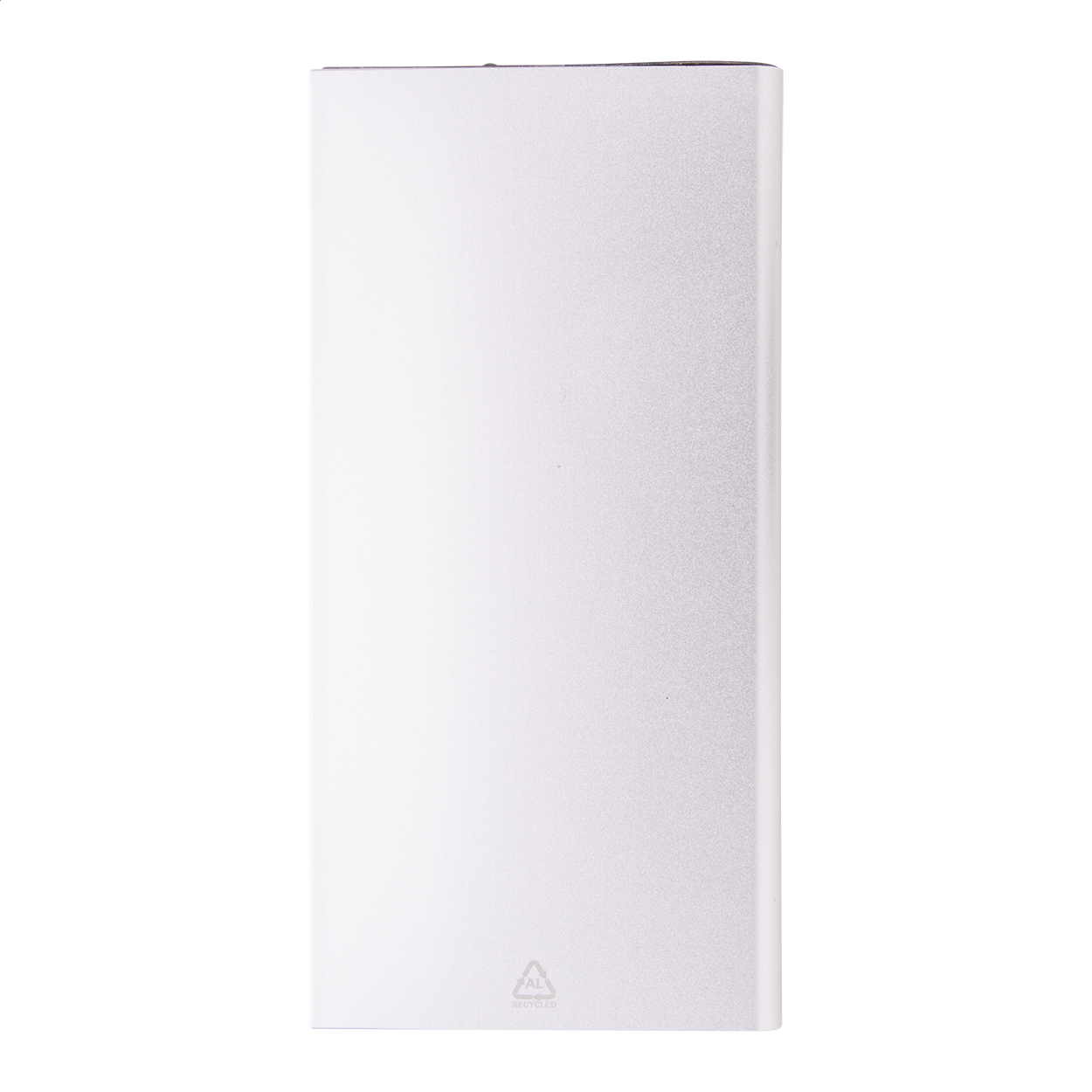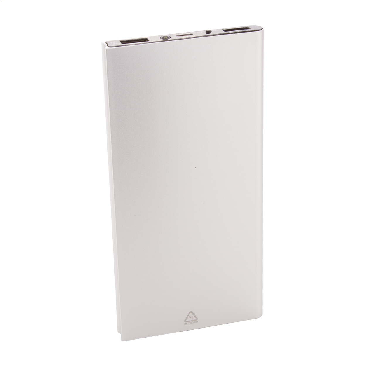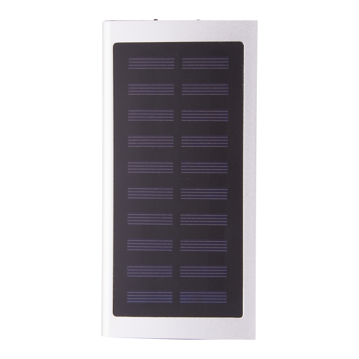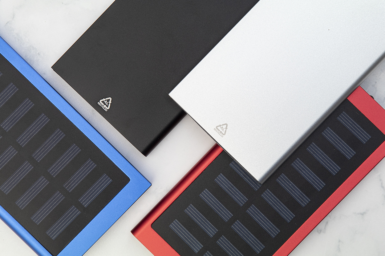 Power bank USB in alluminio riciclato con caricatore solare integrato, batteria da 4000 mAh e con 2 porte di ricarica USB e 1 USB-C. Porta di ingresso USB-C. Cavo di ricarica USB incluso.
