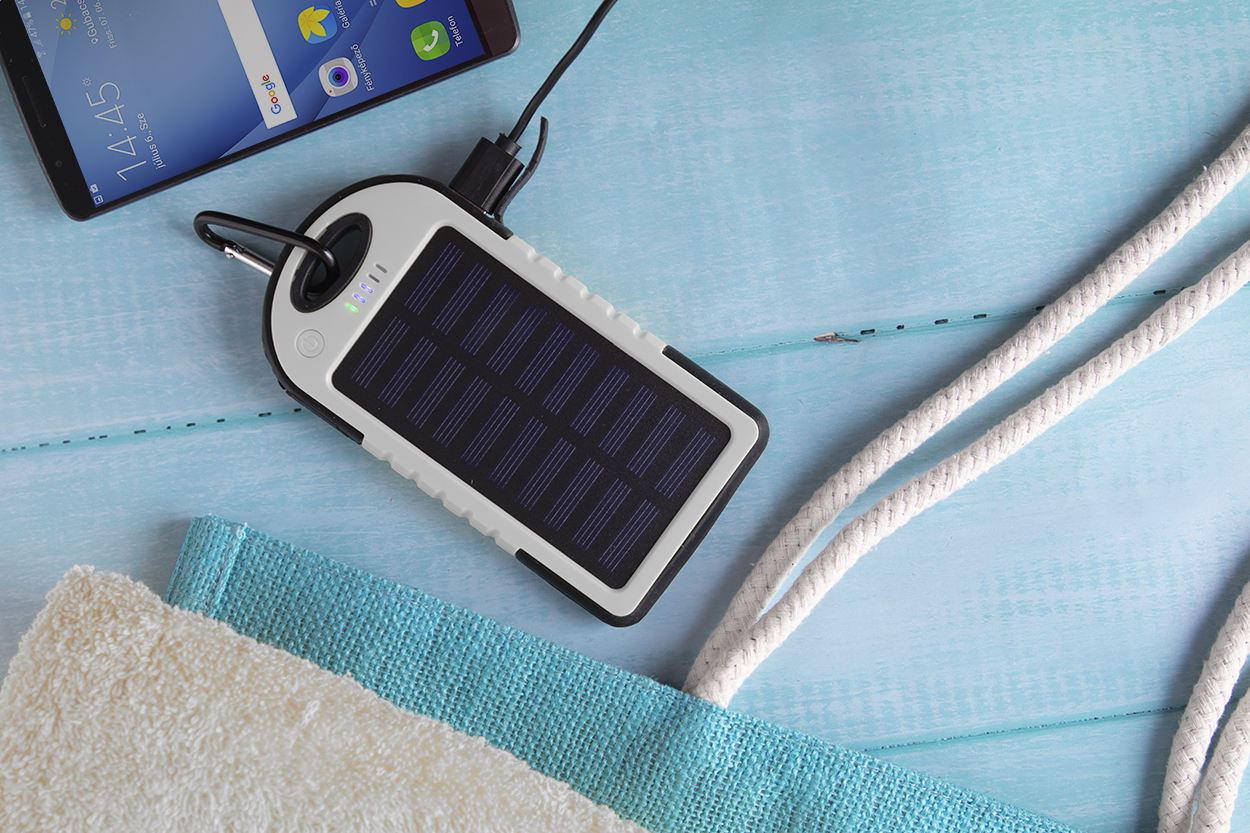 USB power bank da 4000 mAh a ricarica solare, corpo in plastica e silicone e 1 luce LED. Compreso cavo di ricarica micro USB.