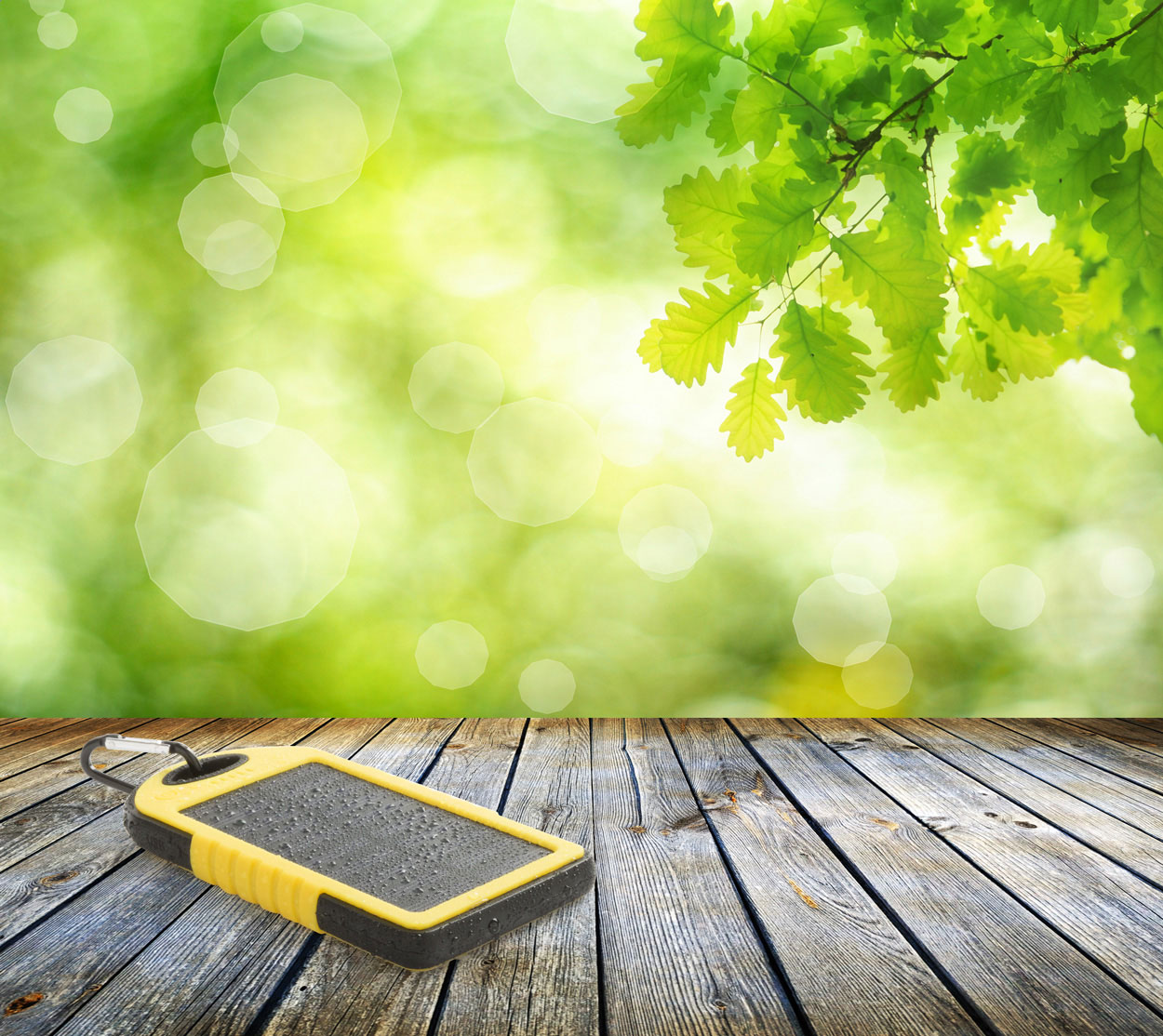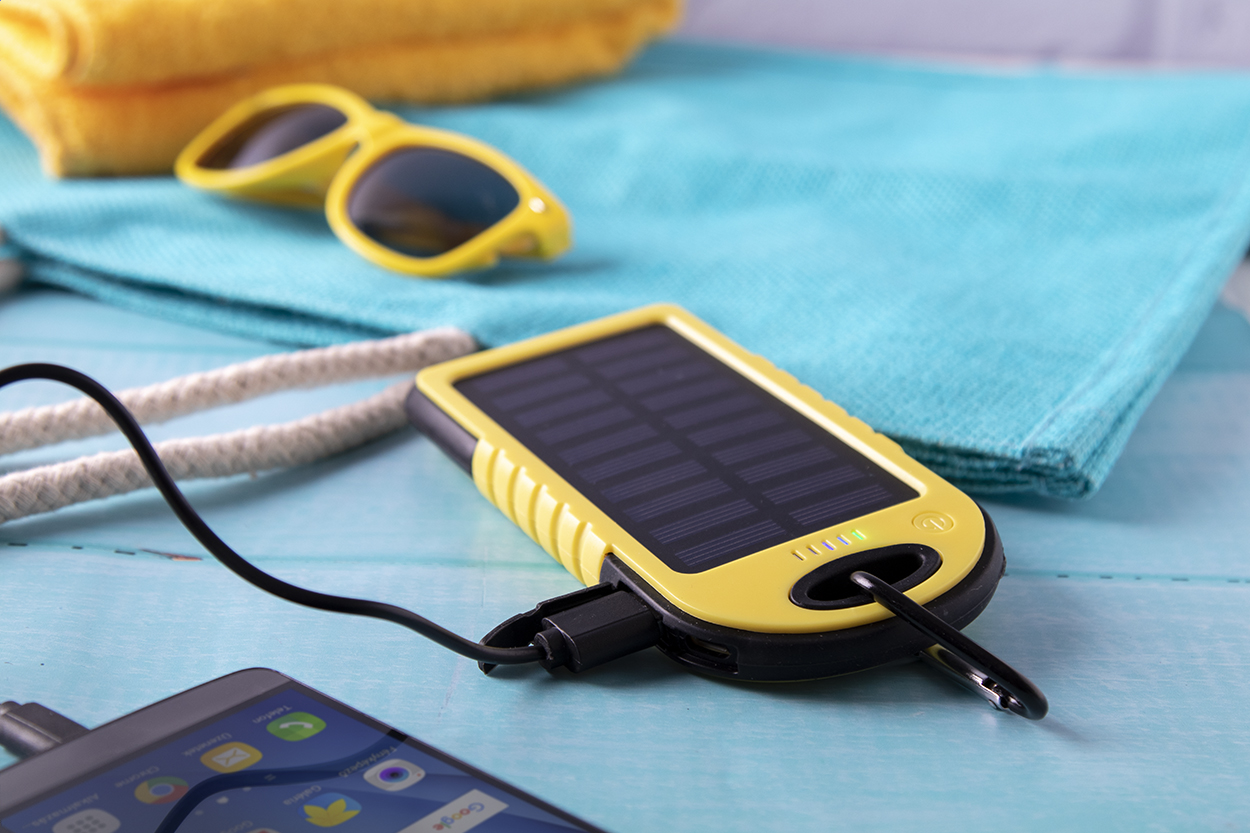 USB power bank da 4000 mAh a ricarica solare, corpo in plastica e silicone e 1 luce LED. Compreso cavo di ricarica micro USB.
