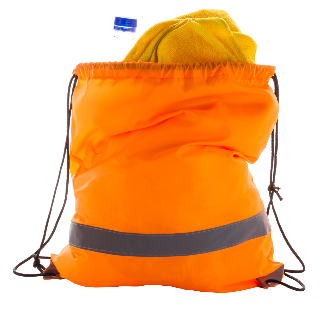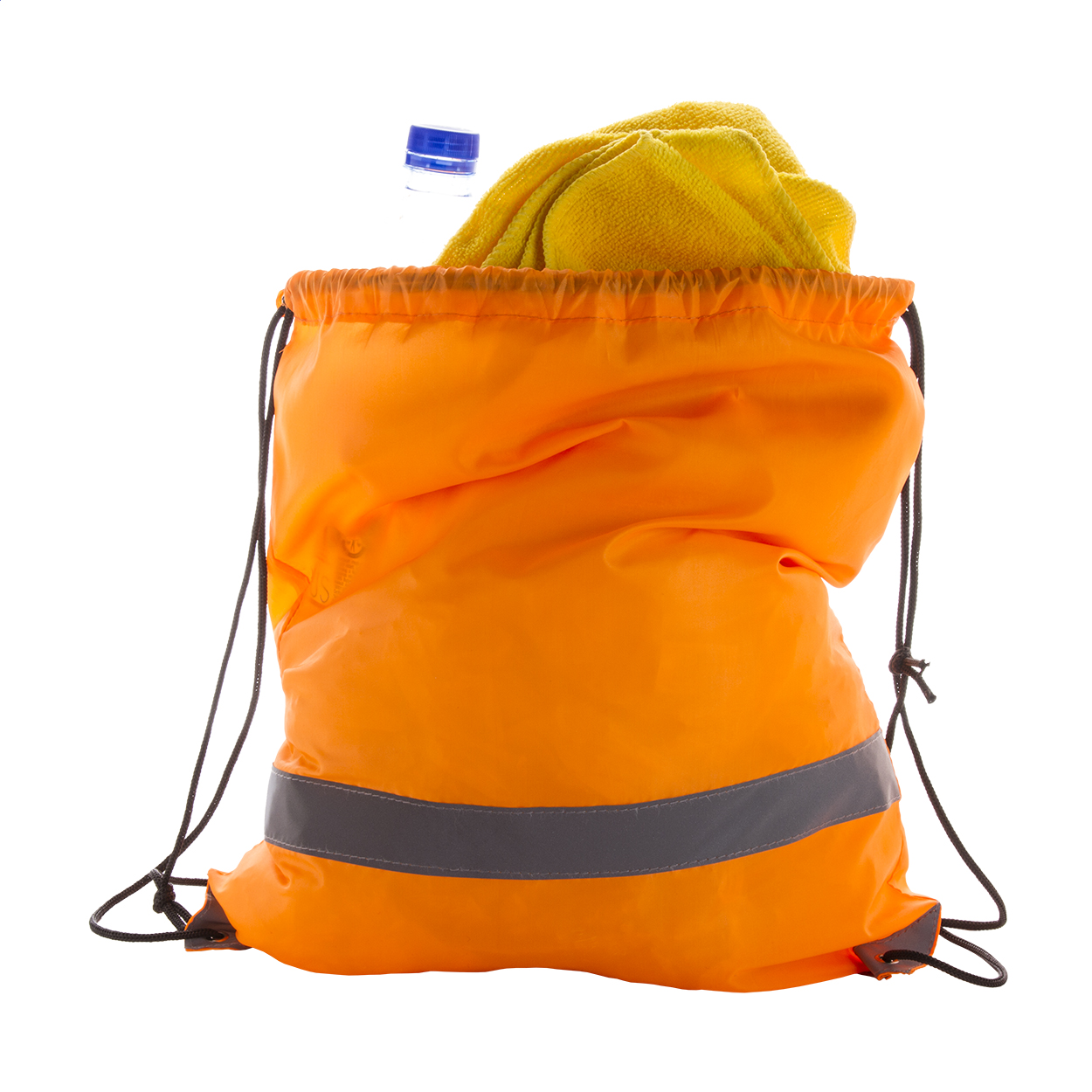 Sacca in poliestere 190T con strisce riflettenti alta visibilità. Solo per uso promozionale, il prodotto non può essere considerato un dispositivo di protezione personale.