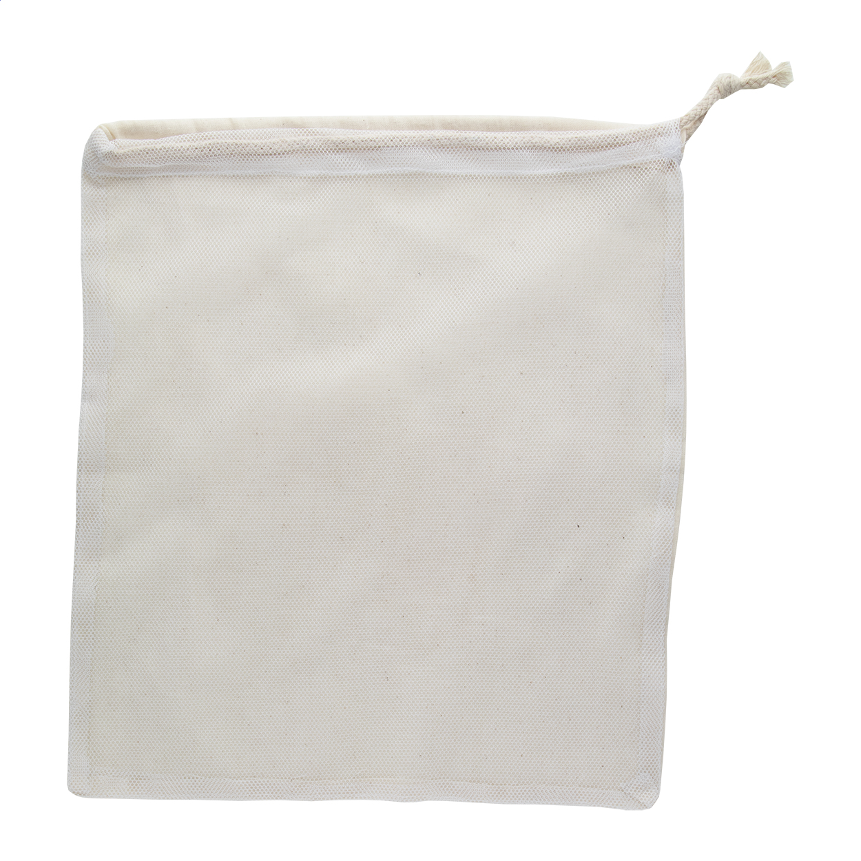 Sacchetto riutilizzabile in cotone con fronte in rete di poliestere e chiusura con coulisse, 95 g/m².