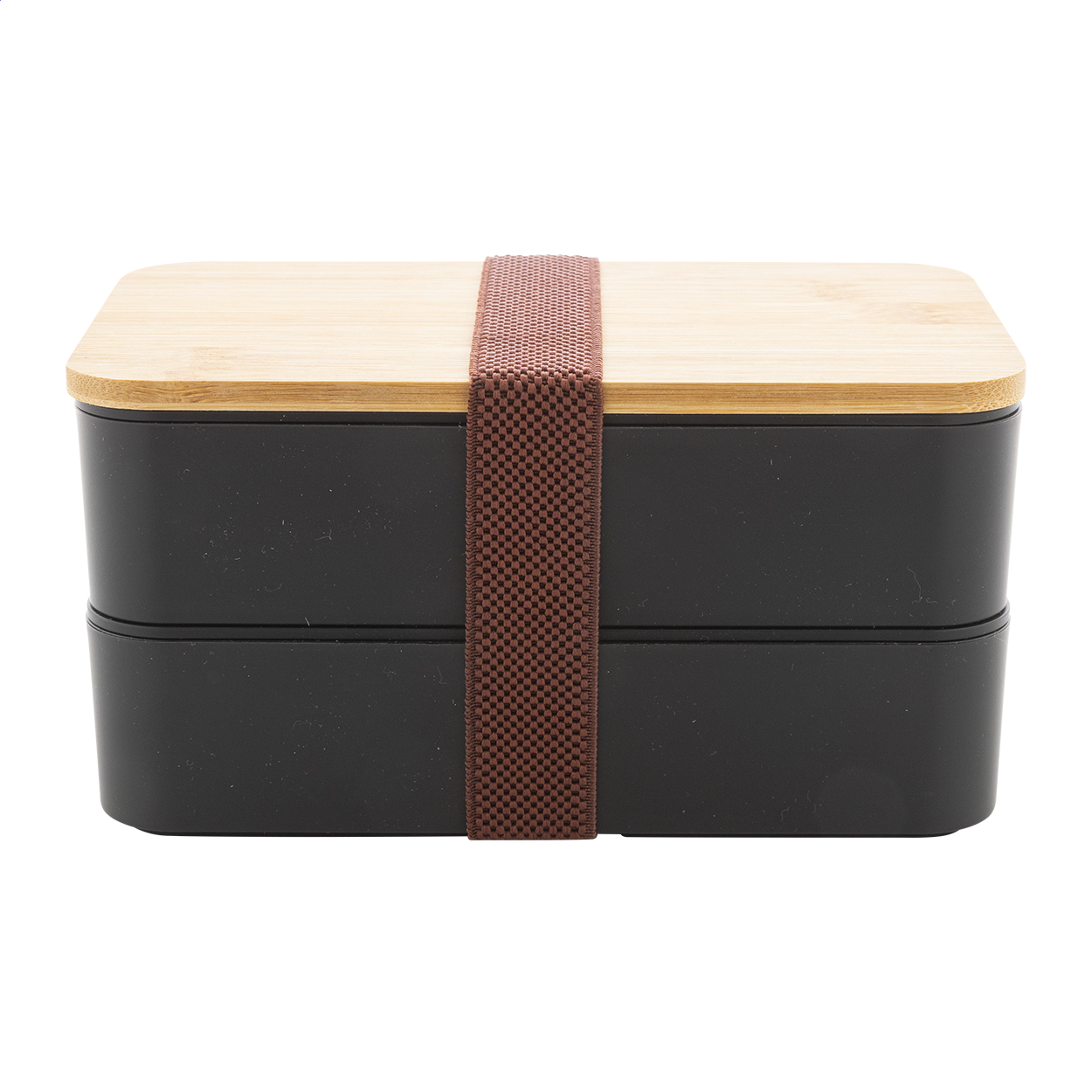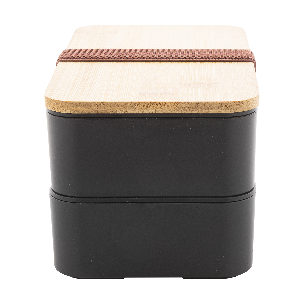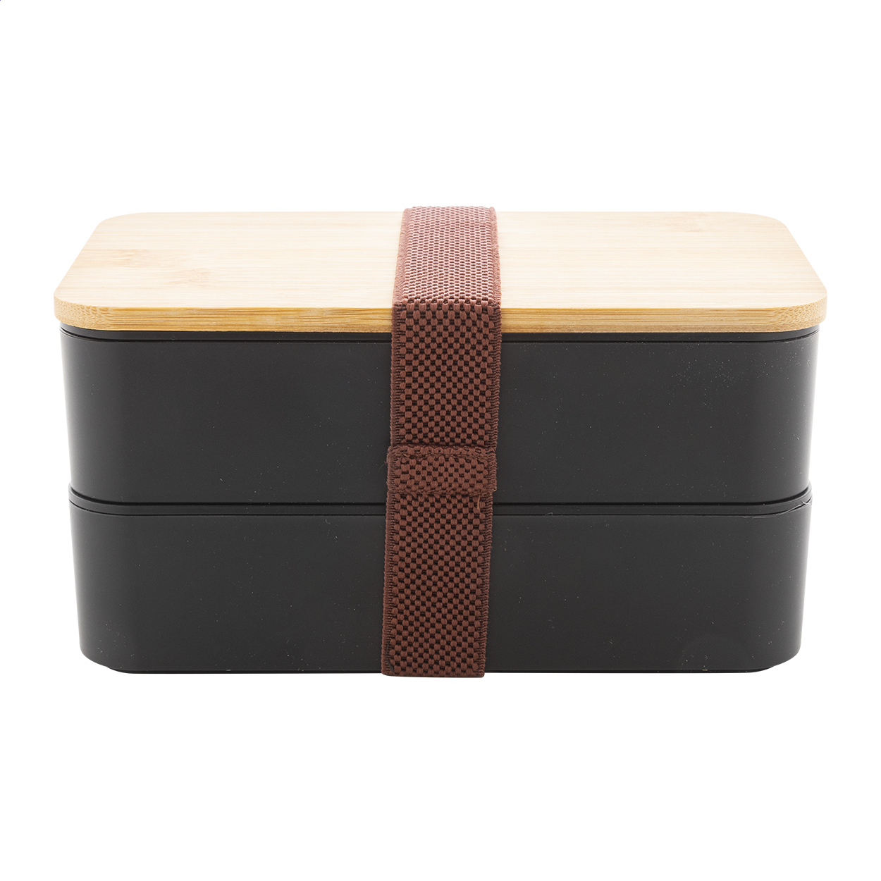 Contenitore per il pranzo in plastica PP con set di posate (forchetta, cucchiaio e coltello), coperchio in bambù e cinturino elastico. Con 2 scomparti di 700 ml di capacità ciascuno.