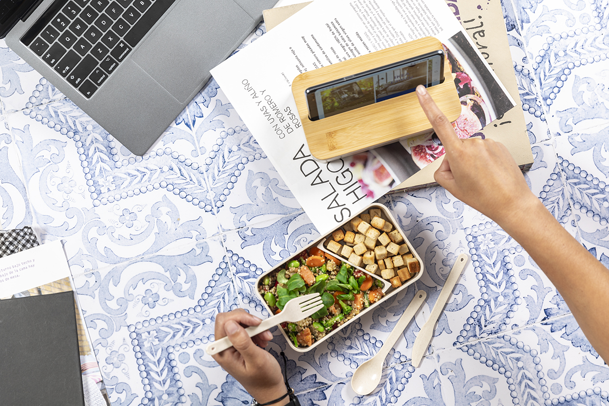 Contenitore per il pranzo in plastica PP con set di posate (forchetta, cucchiaio e coltello), coperchio in bambù con portacellulare e cinturino elastico. Con 2 scomparti della capacità di 700 ml ciascuno.