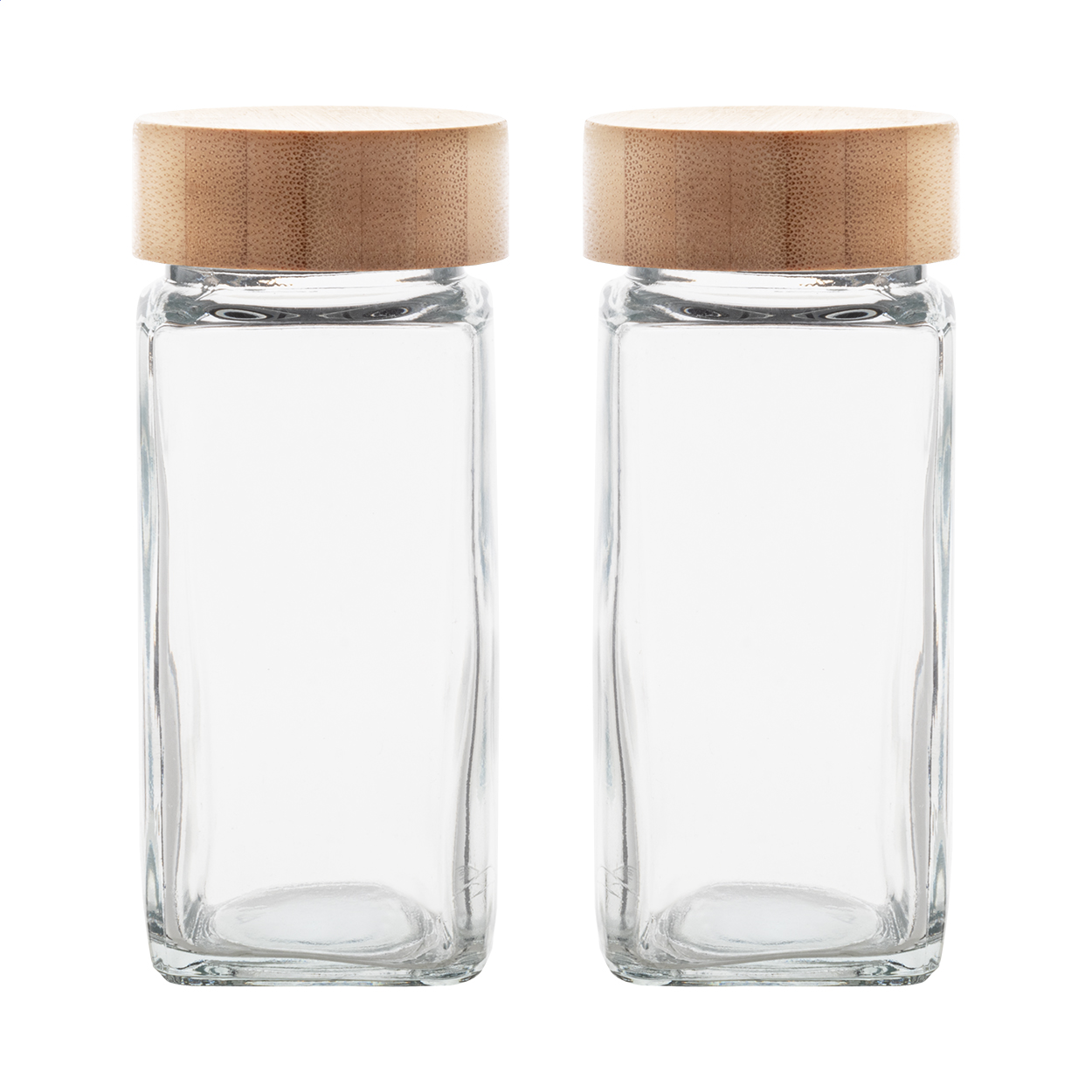 Set 2 porta spezie da 120 ml. in vetro con coperchio in bambù. Confezione in scatola di cartoncino kraft.