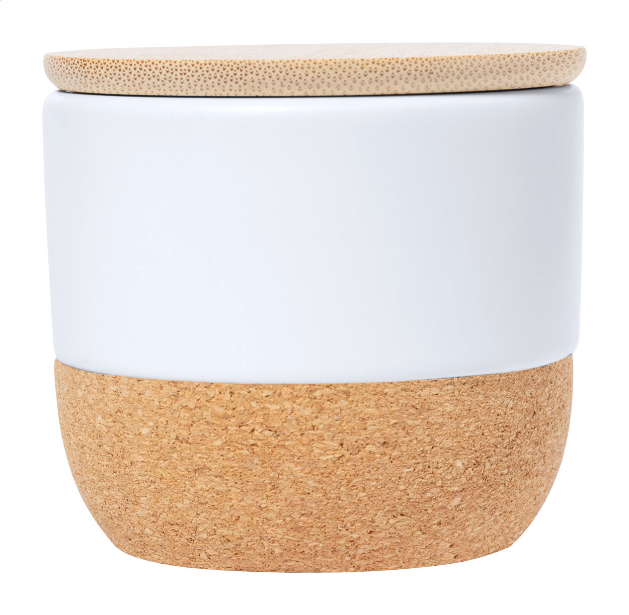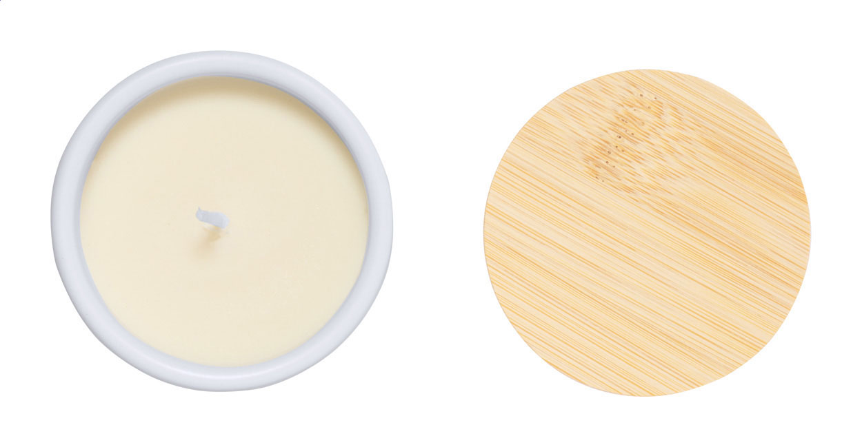 Candela in cera vegetale profumata alla vaniglia con portacandela in ceramica, fondo in sughero naturale e coperchio in bambù.