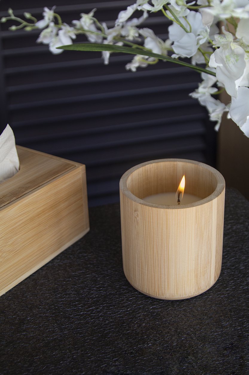 Candela da 160 grammi di cera vegetale con profumazione alla vaniglia e contenitore in bambù. Confezione in scatola di cartoncino kraft.