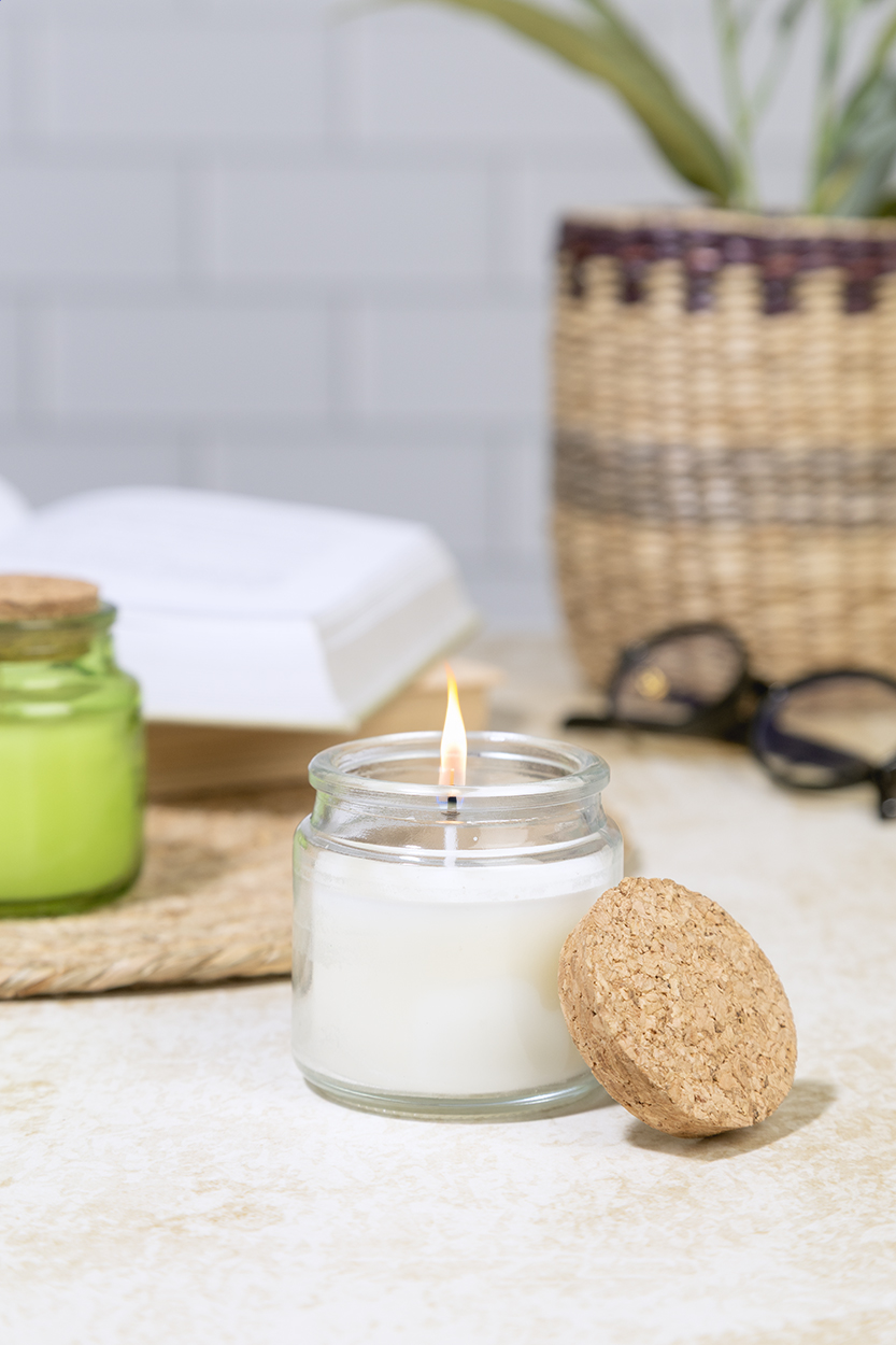 Candela in cera vegetale profumata alla vaniglia contenuta in un contenitore di vetro con coperchio in sughero naturale. Contenente 80 grammi di cera. Durata: 16 ore circa. Confezione in scatola di cartoncino kraft.