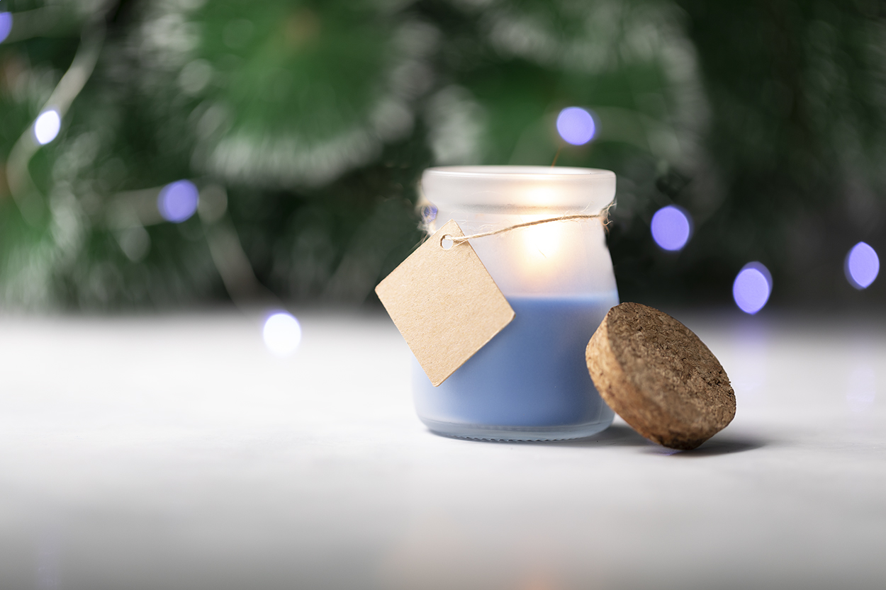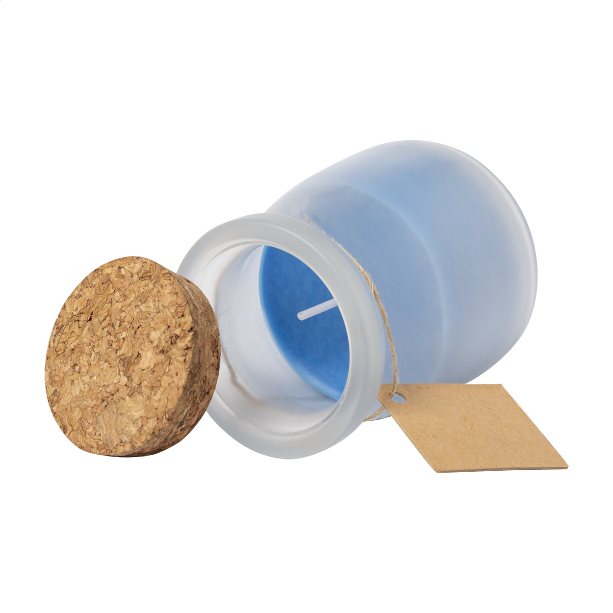 Candela profumata in vaso di vetro e coperchio in sughero.