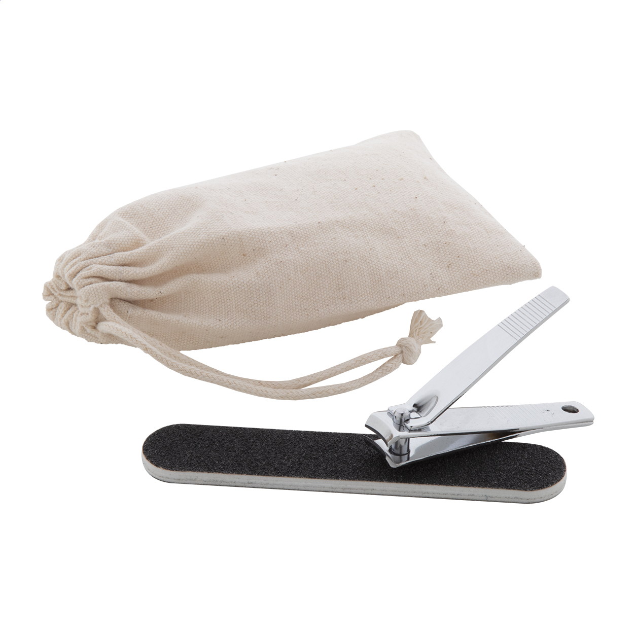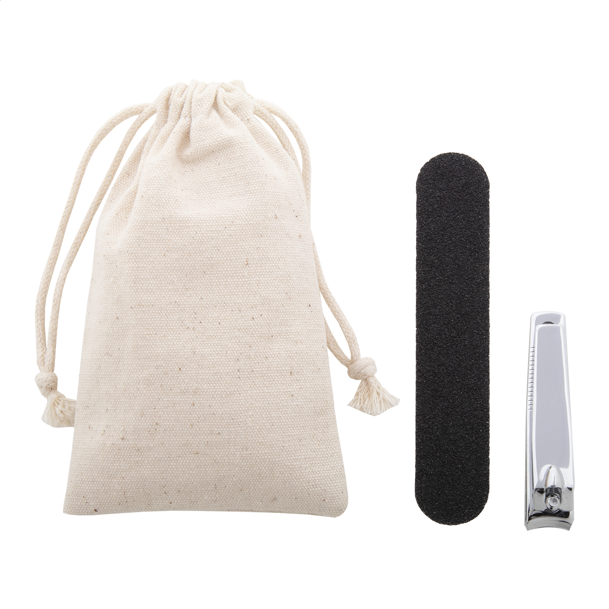 Set per manicure in sacchetto di cotone con chiusura a coulisse. Include una lima per unghie e un tagliaunghie.