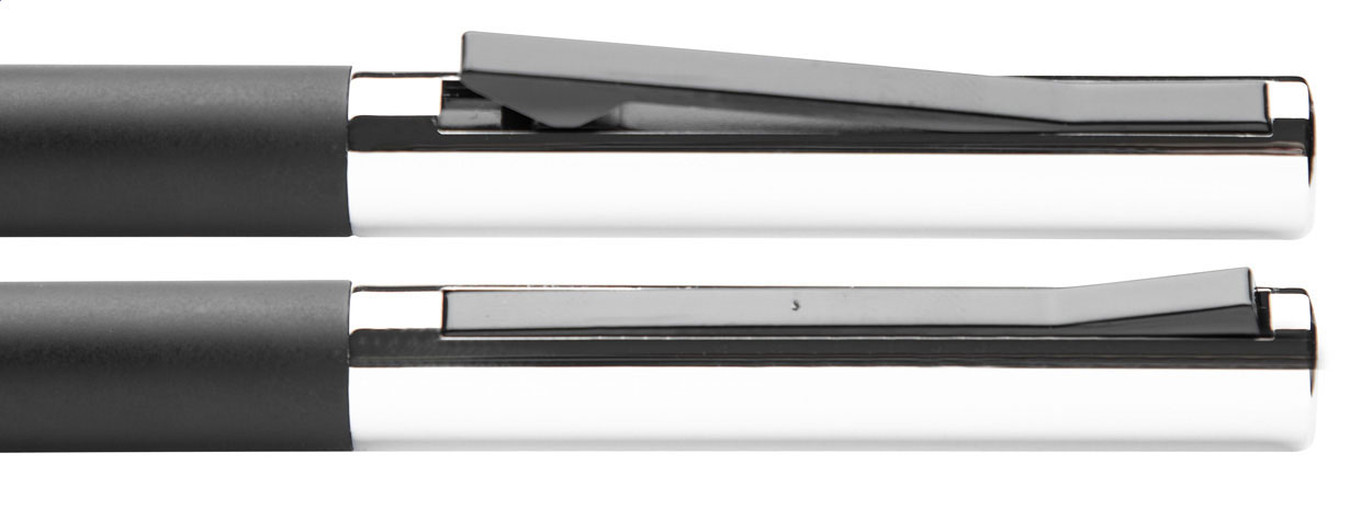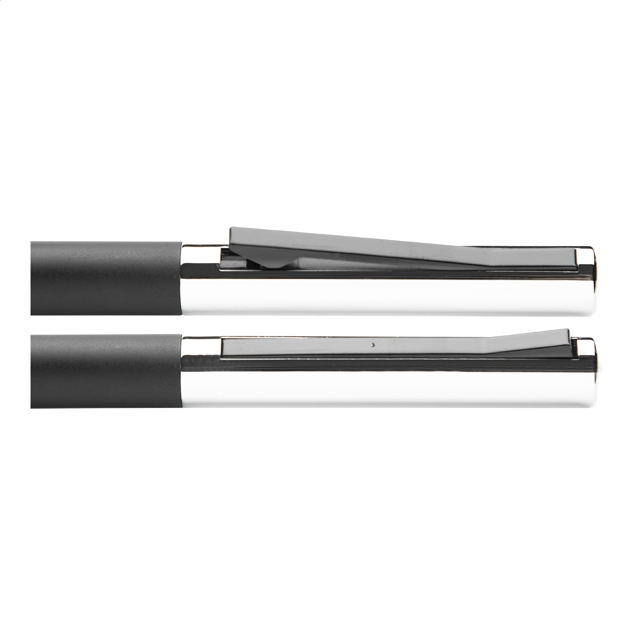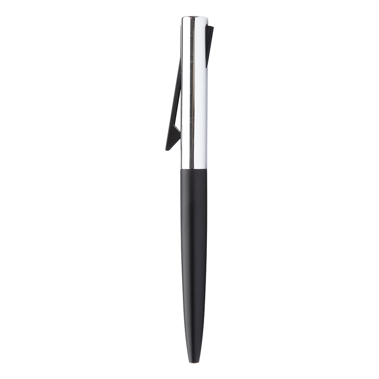 Penna a sfera in alluminio con particolare movimento della clip, confezionata in scatola di metallo coordinata Con refill blu.