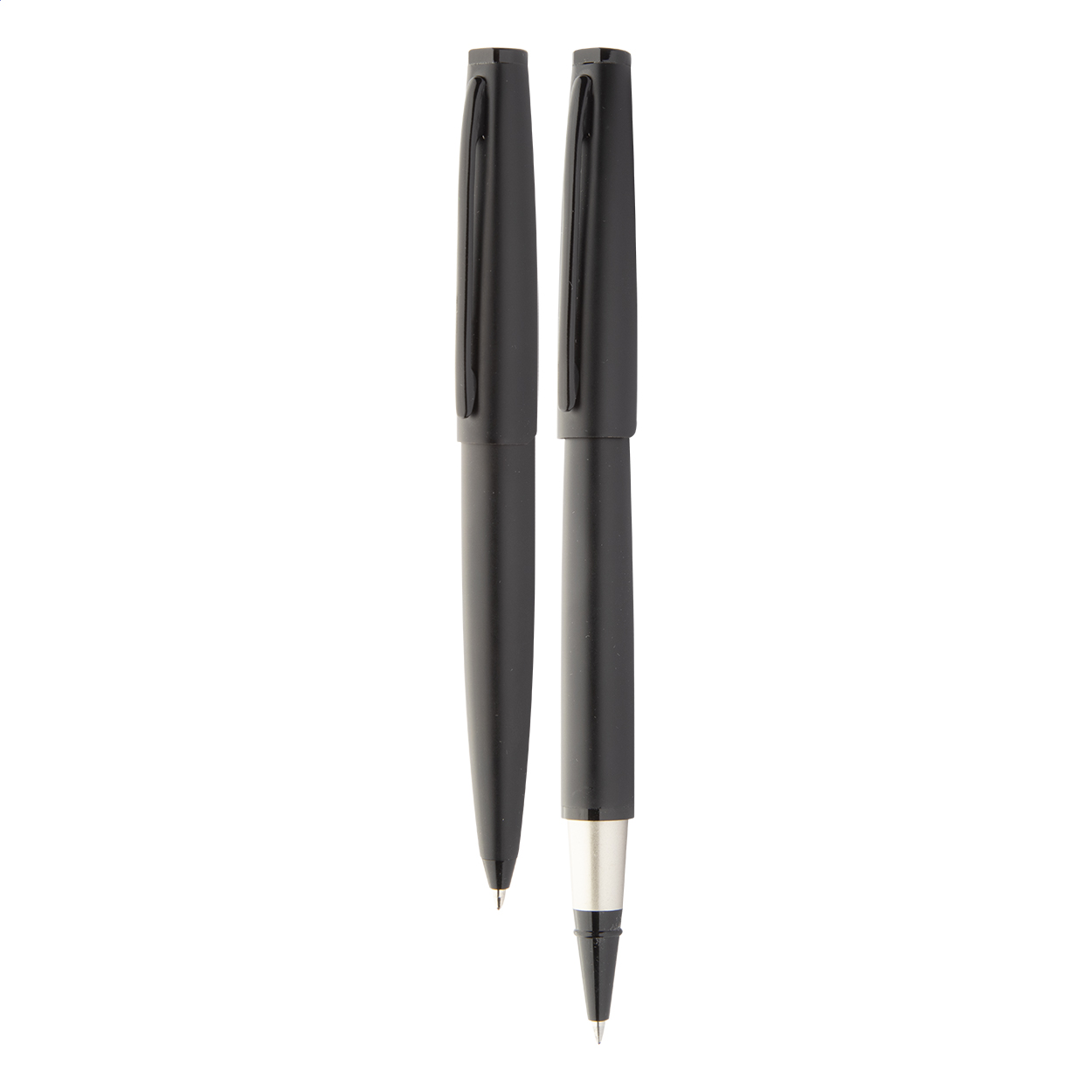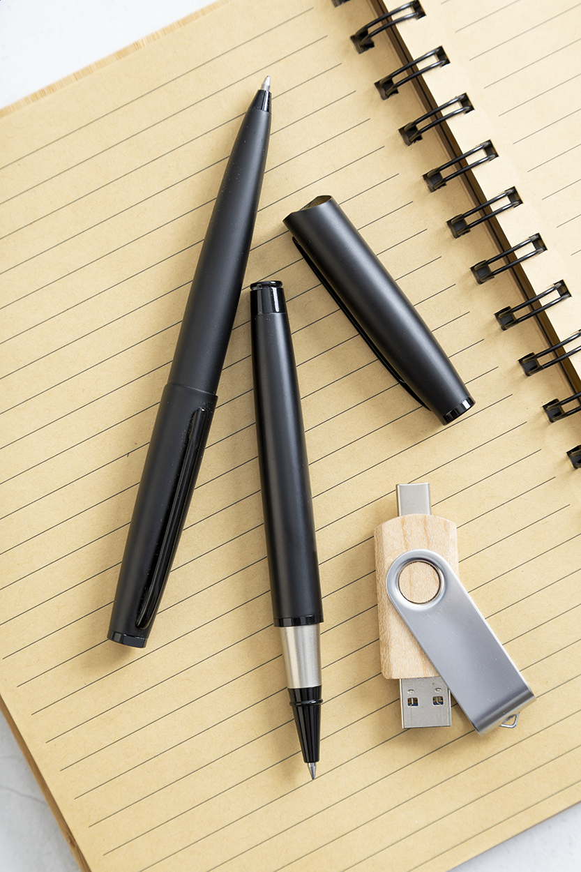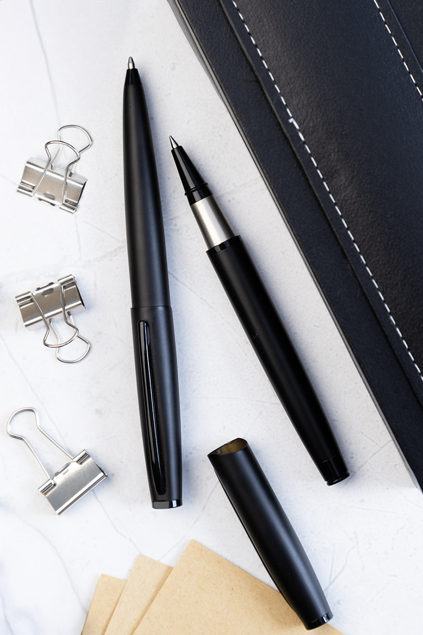 Set composto da una penna a sfera ed una penna roller in metallo con finitura nera opaca. Fornito in astuccio regalo e refill blu. Prodotto a marchio André Philippe.