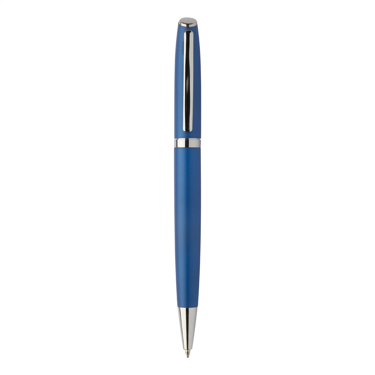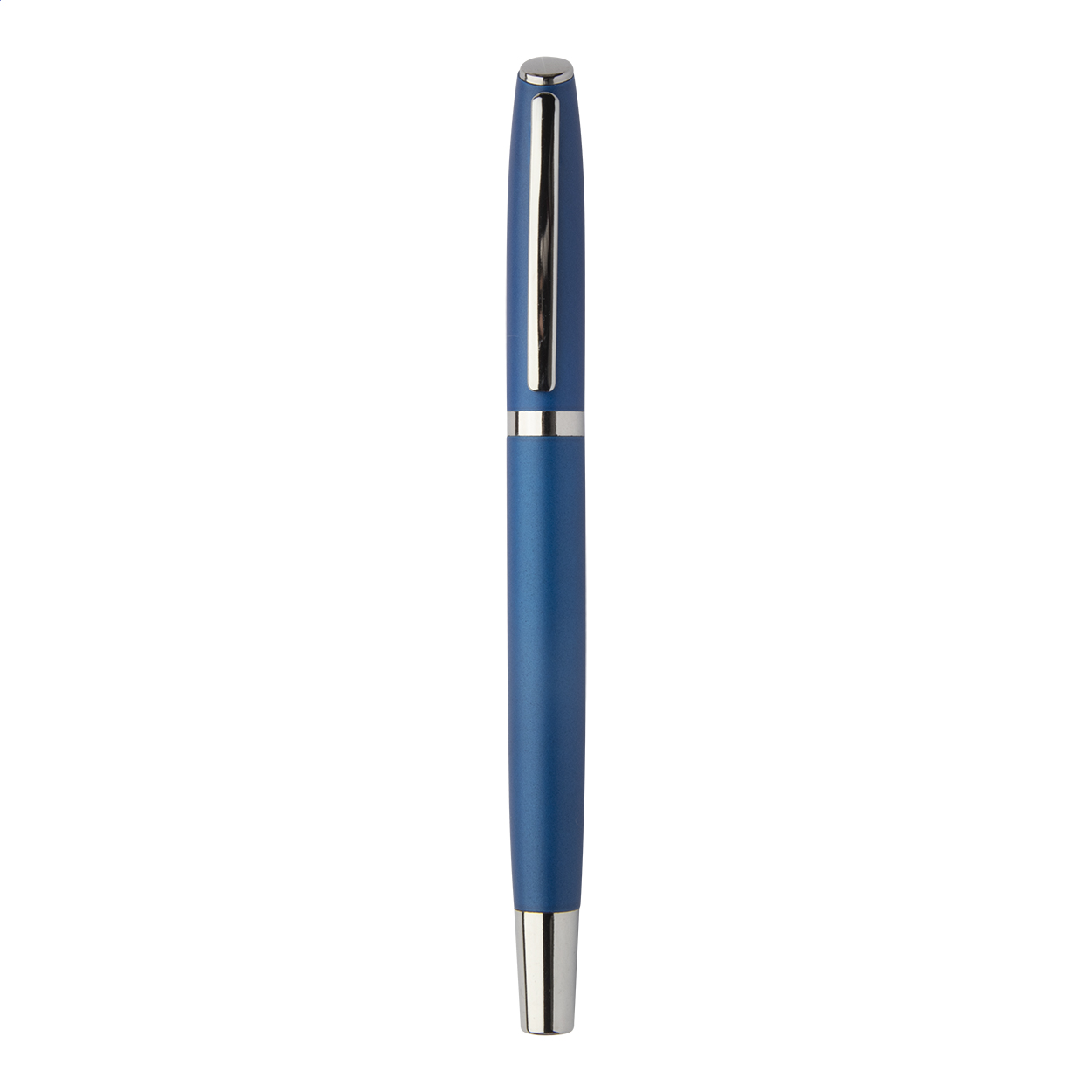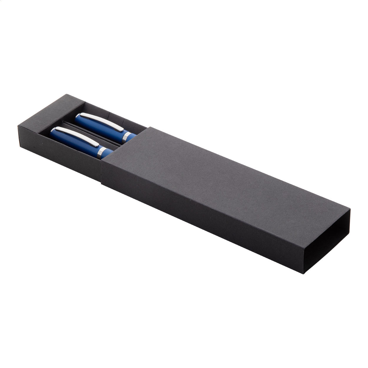 Set di penne con refill blu, in alluminio riciclato composto da penna roller e penna a sfera in confezione regalo di cartoncino nero.