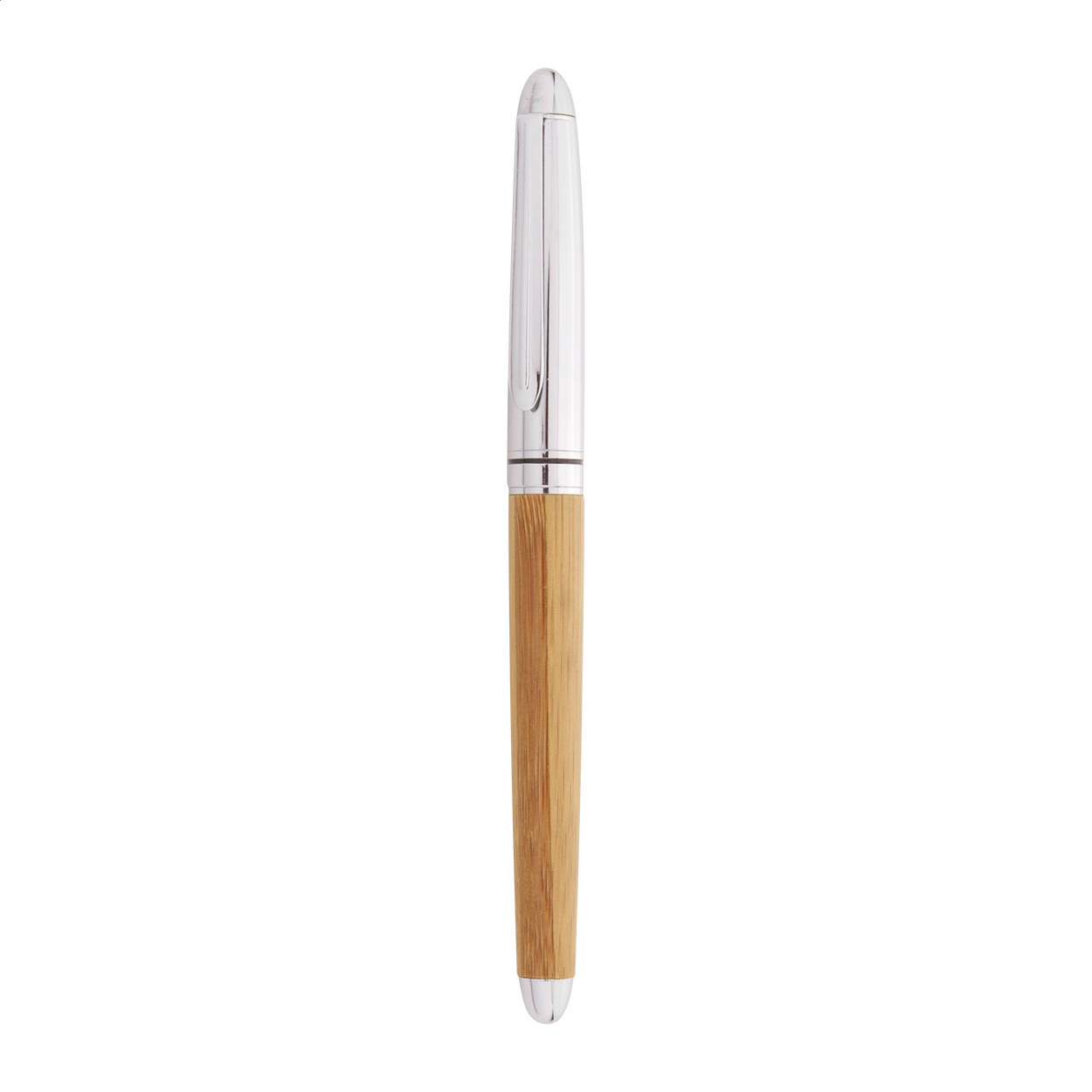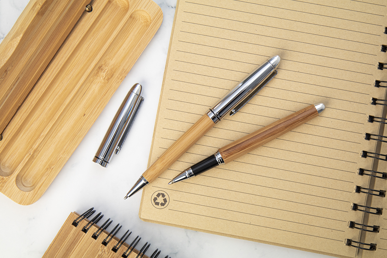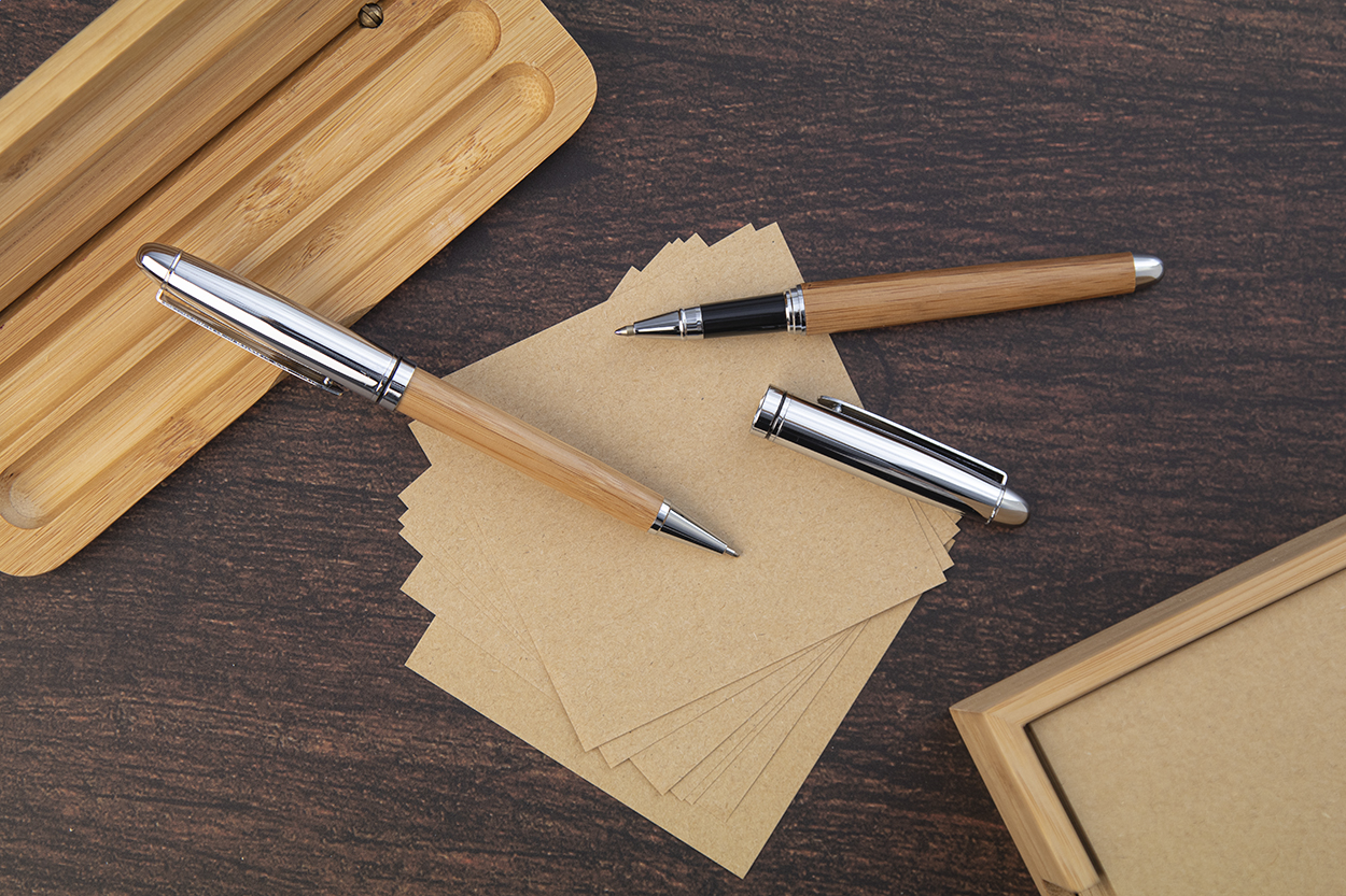 Elegante set di penne in bambù e metallo composta da una penna a sfera ed una penna roller in confezione regalo in bambù. Con refill blu.