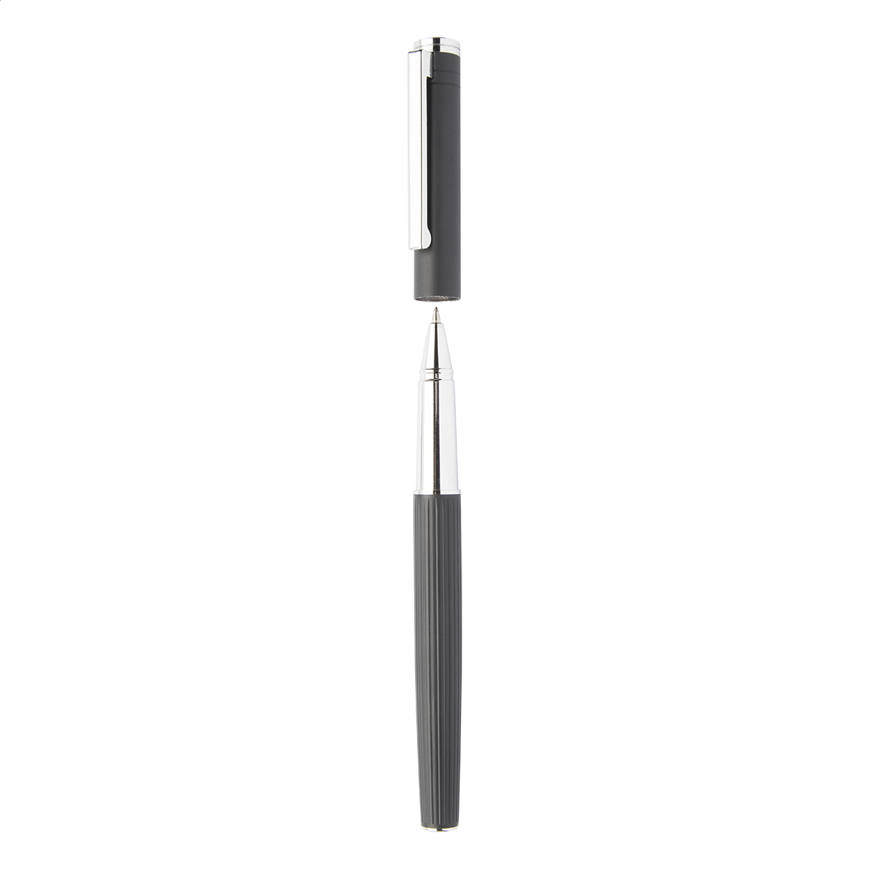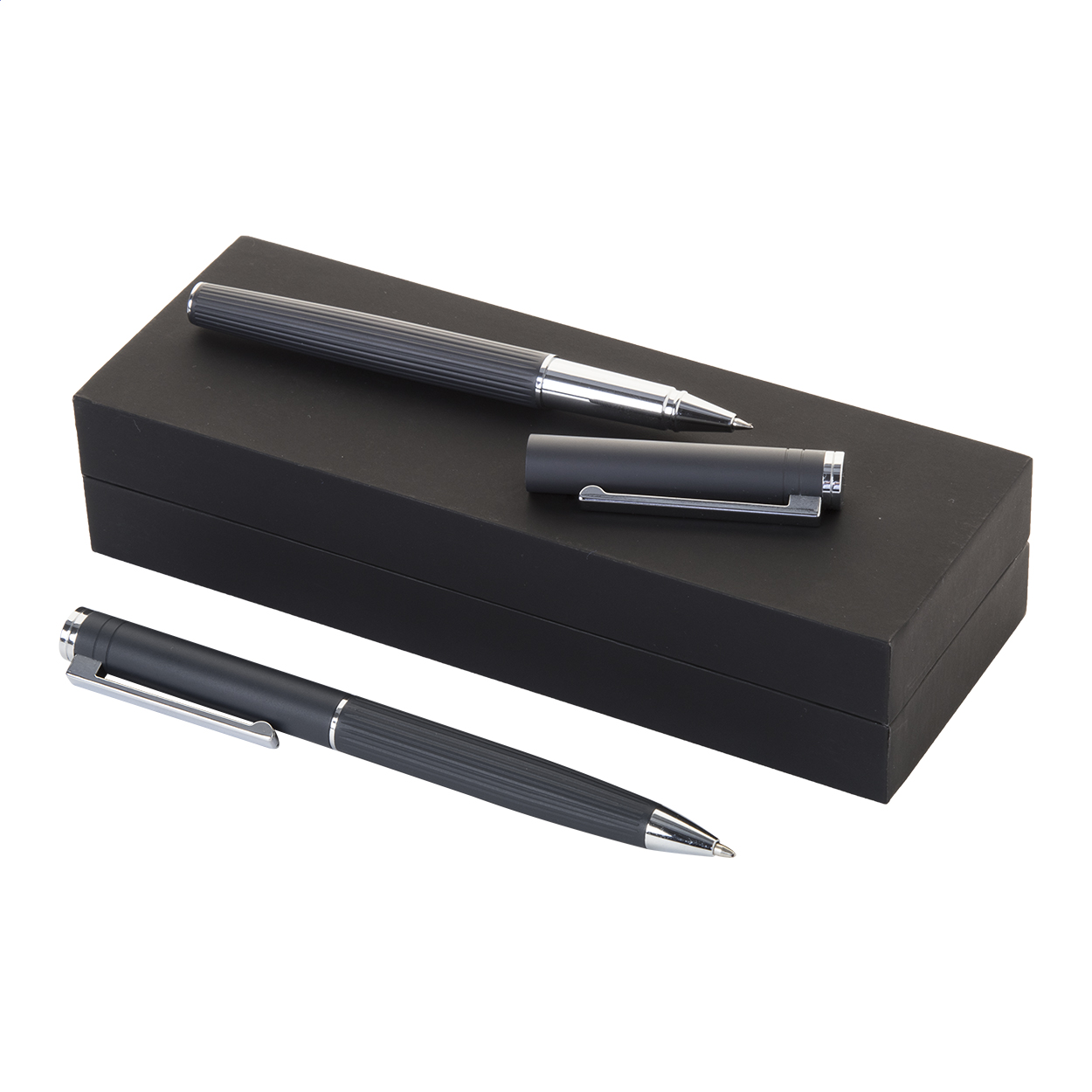 Elegante set composto da una penna a sfera ed una roller con fusto in alluminio testurizzato a righe, in confezione regalo nera e refill blu.