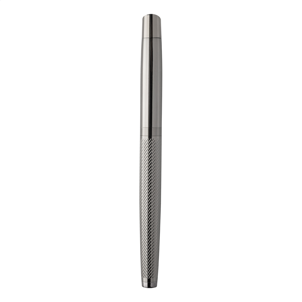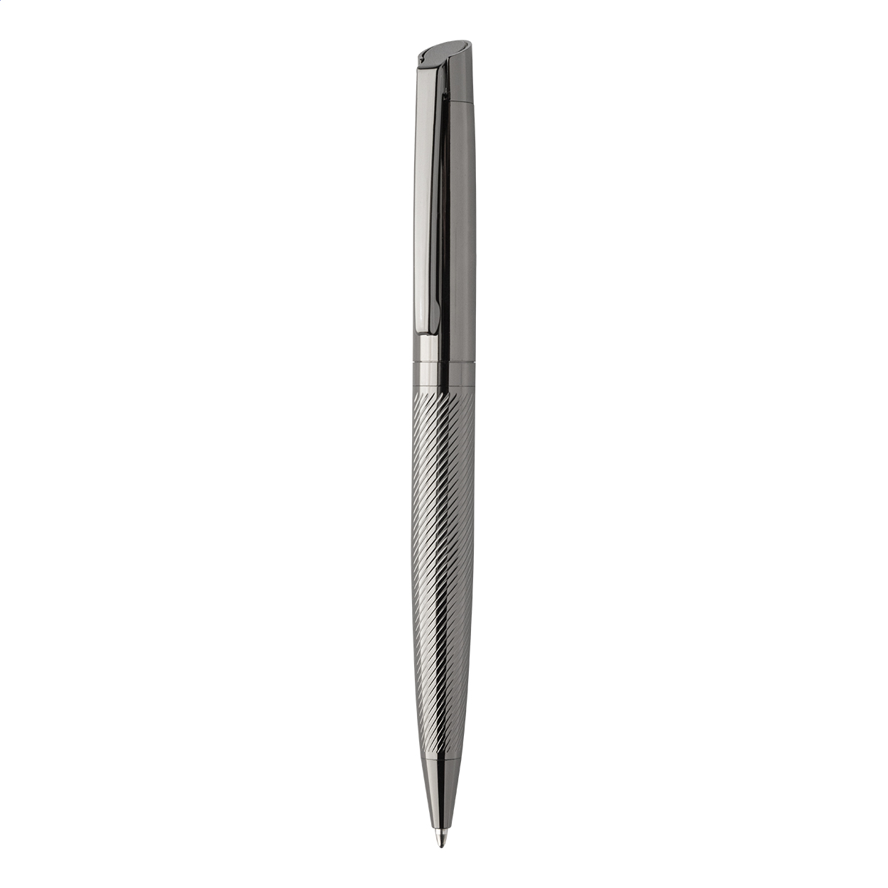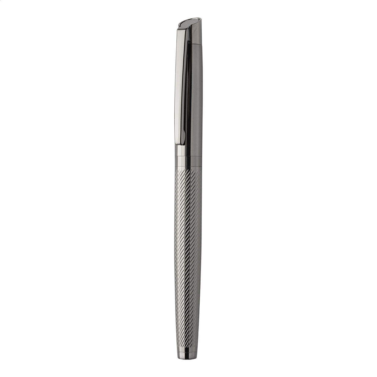 Elegante set composto da una penna a sfera e da una penna roller in metallo con fusto dalla texture diagonale e refill blu. Set fornito in confezione regalo bicolore. Prodotto a marchio André Philippe.