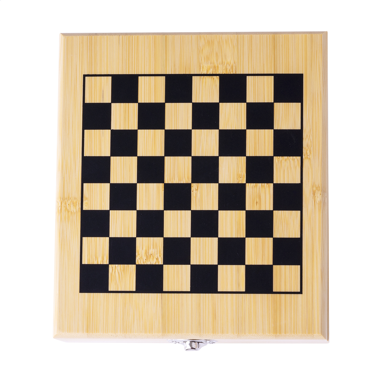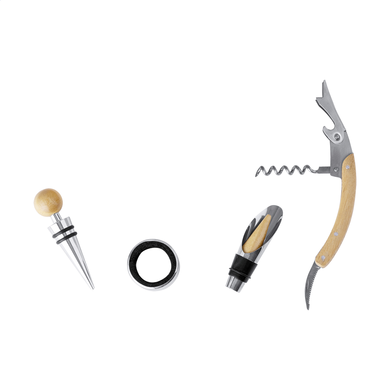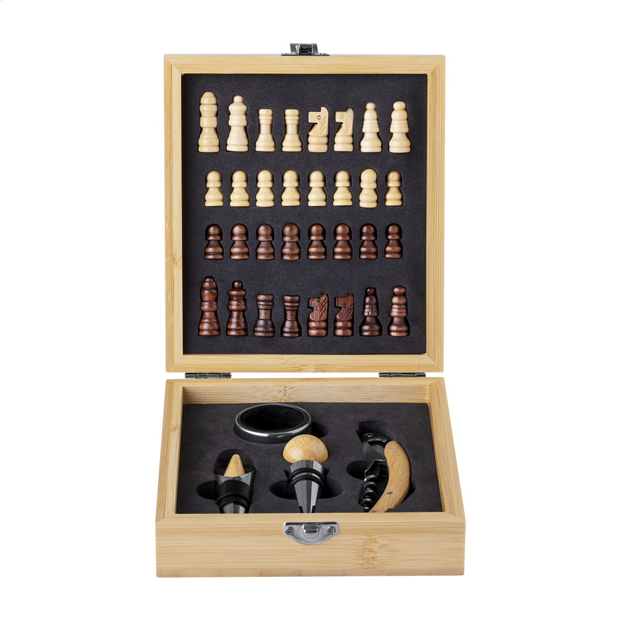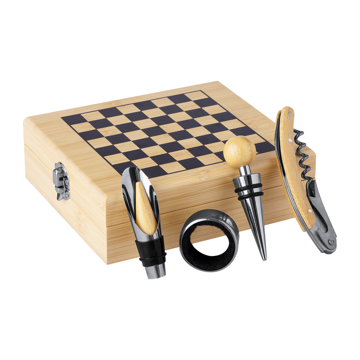 Set da vino da 4 pezzi in acciaio inox contenuti in una scatola in bambù. Il set comprende cavatappi, anello salvagoccia, tappo versatore, tappo e 32 pezzi degli scacchi.
