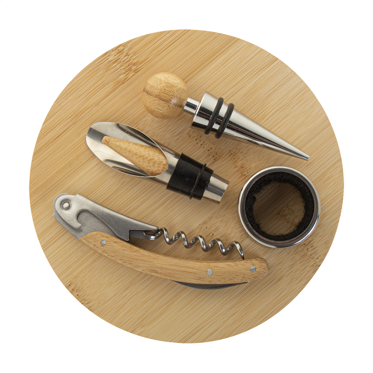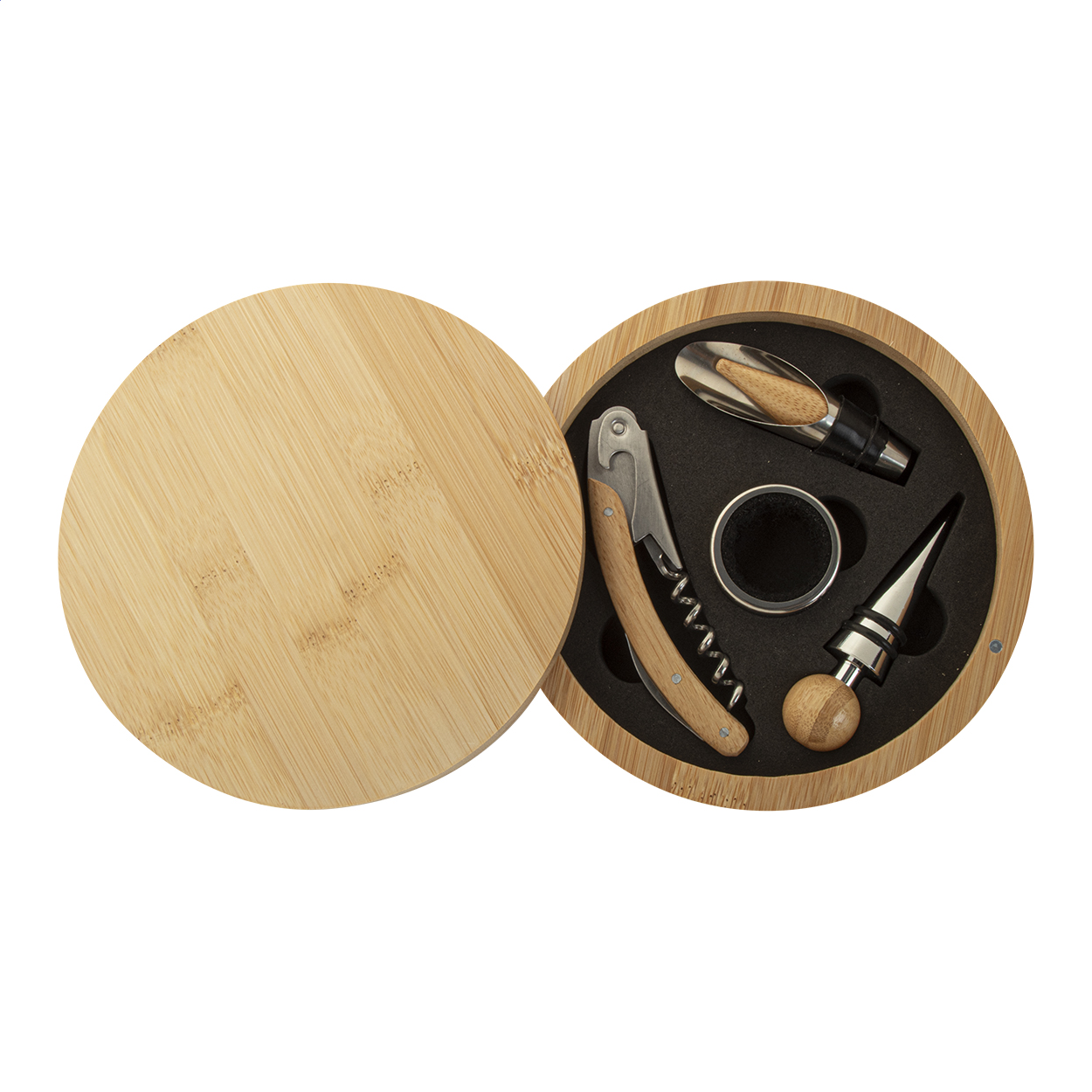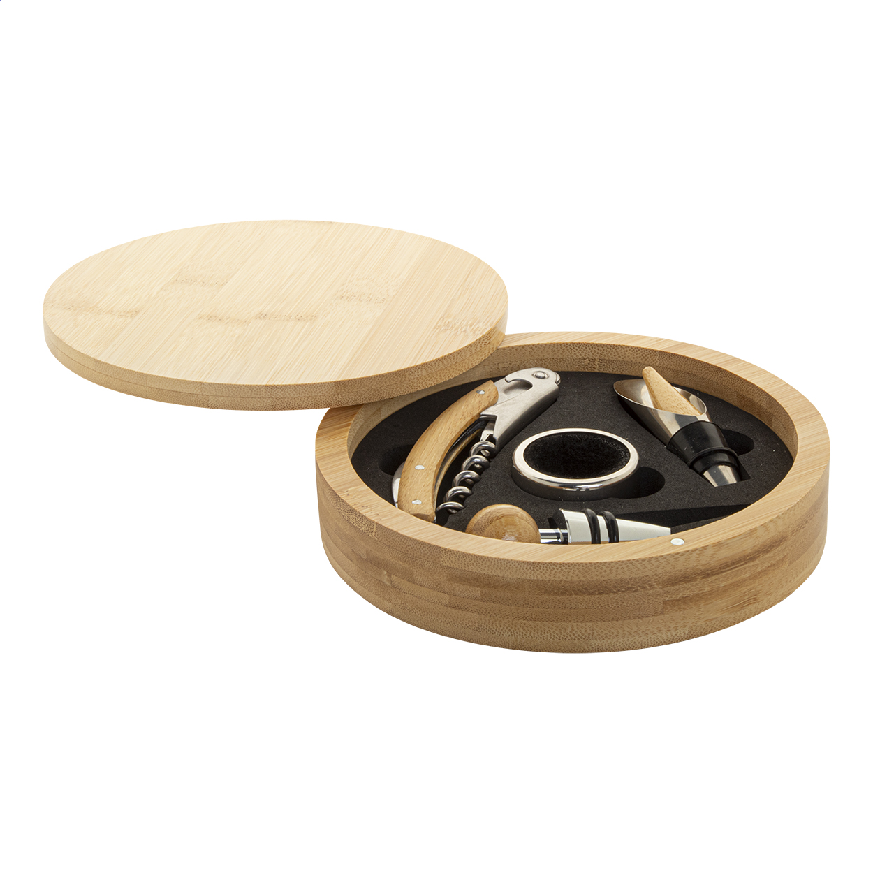 Set vino da 4 pz in acciaio inossidabile con inserti e contenitore rotondo in bambù. Il set si compone di cavatappi, salvagoccia, beccuccio e tappo.